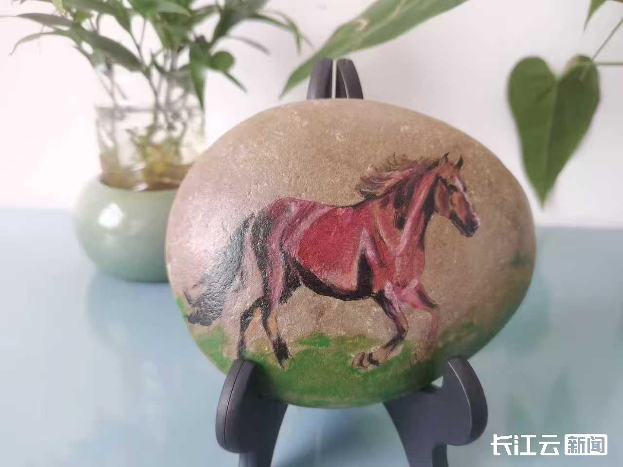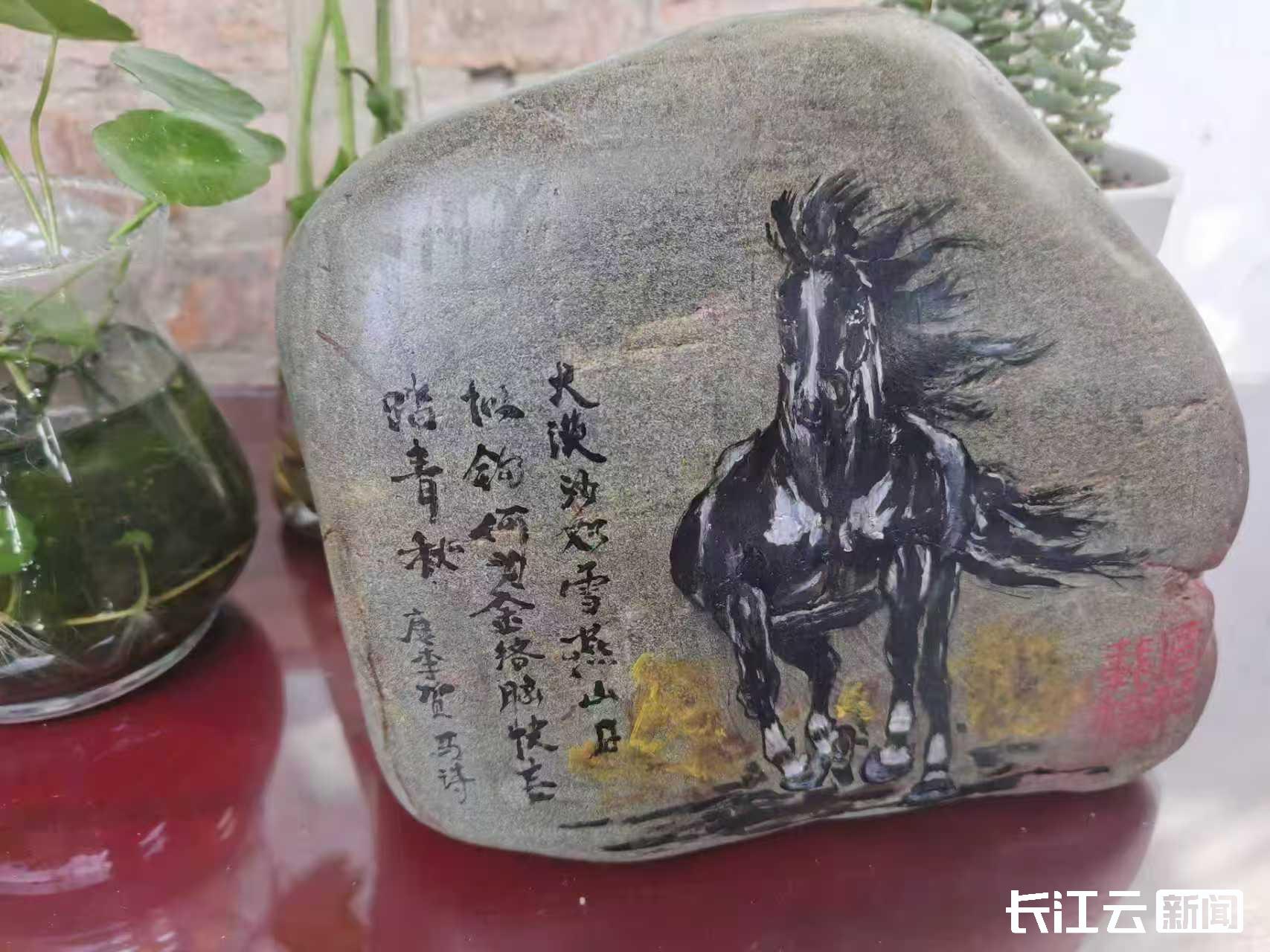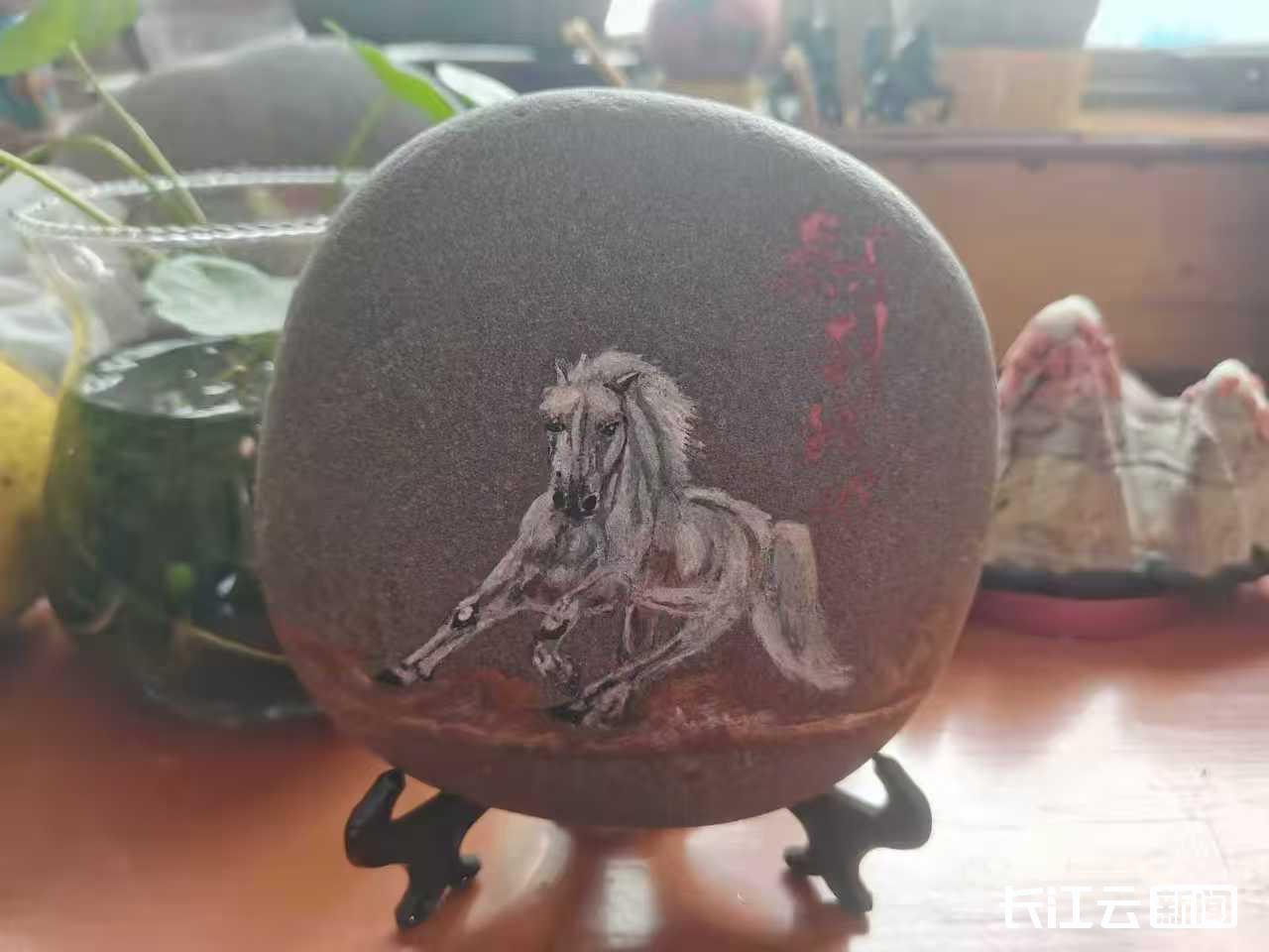 工作之余,他以“马”为主题潜心创作,近20幅素描、石头画、葫芦画等作品跃然眼前。笔下的骏马或奔腾驰骋,或昂首伫立,线条流畅、神态各异,普通的石头、瓦片、葫芦,在他的巧思勾勒下被赋予鲜活生命力。“‘牛马年好种田’,马年寓意着吉祥顺遂。”李明国笑着说,他想以自己最擅长的方式,传递“龙马精神”的昂扬斗志,也送上“马到成功”的美好祝愿。