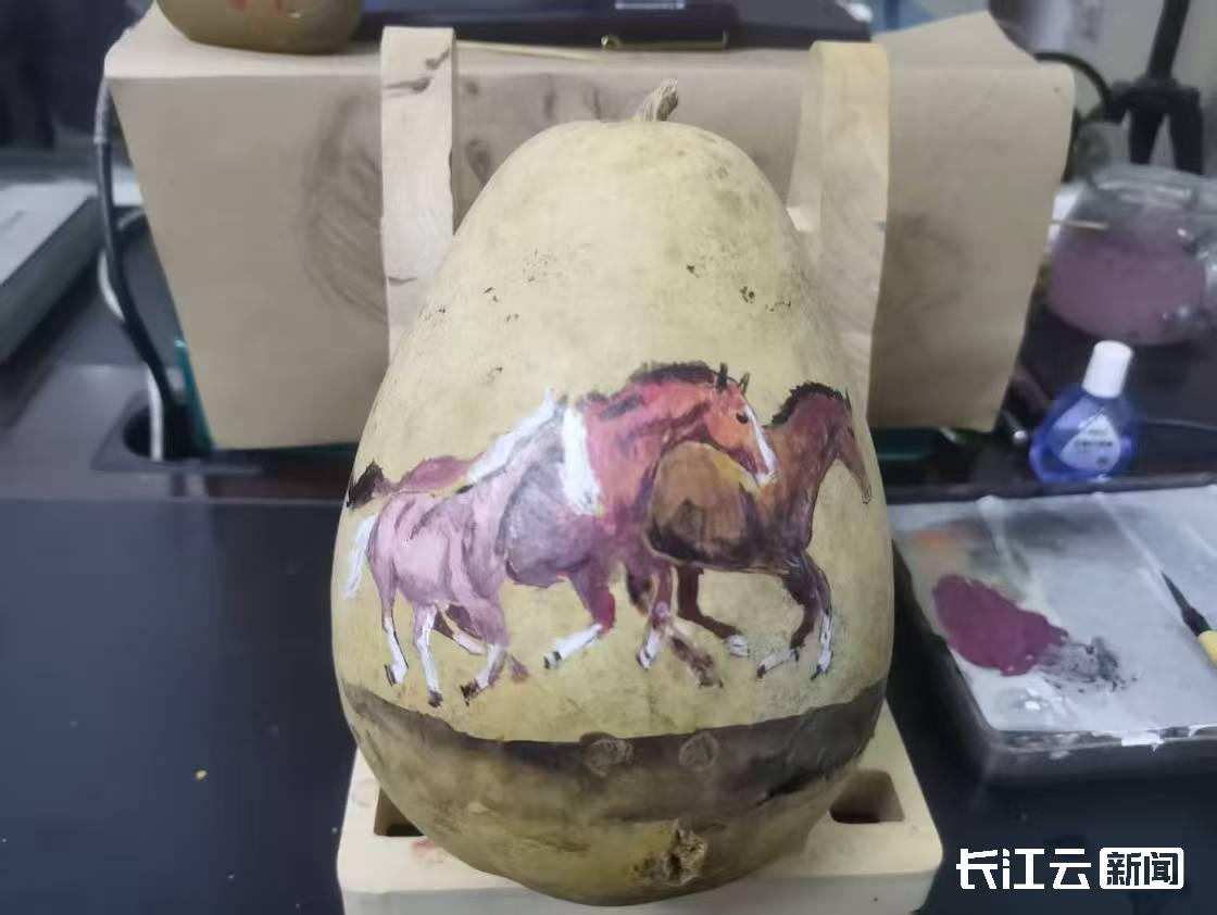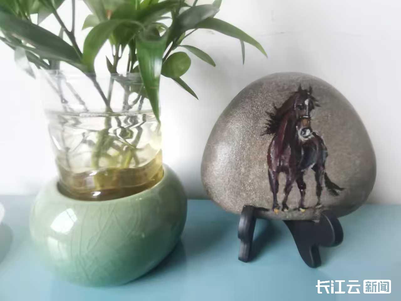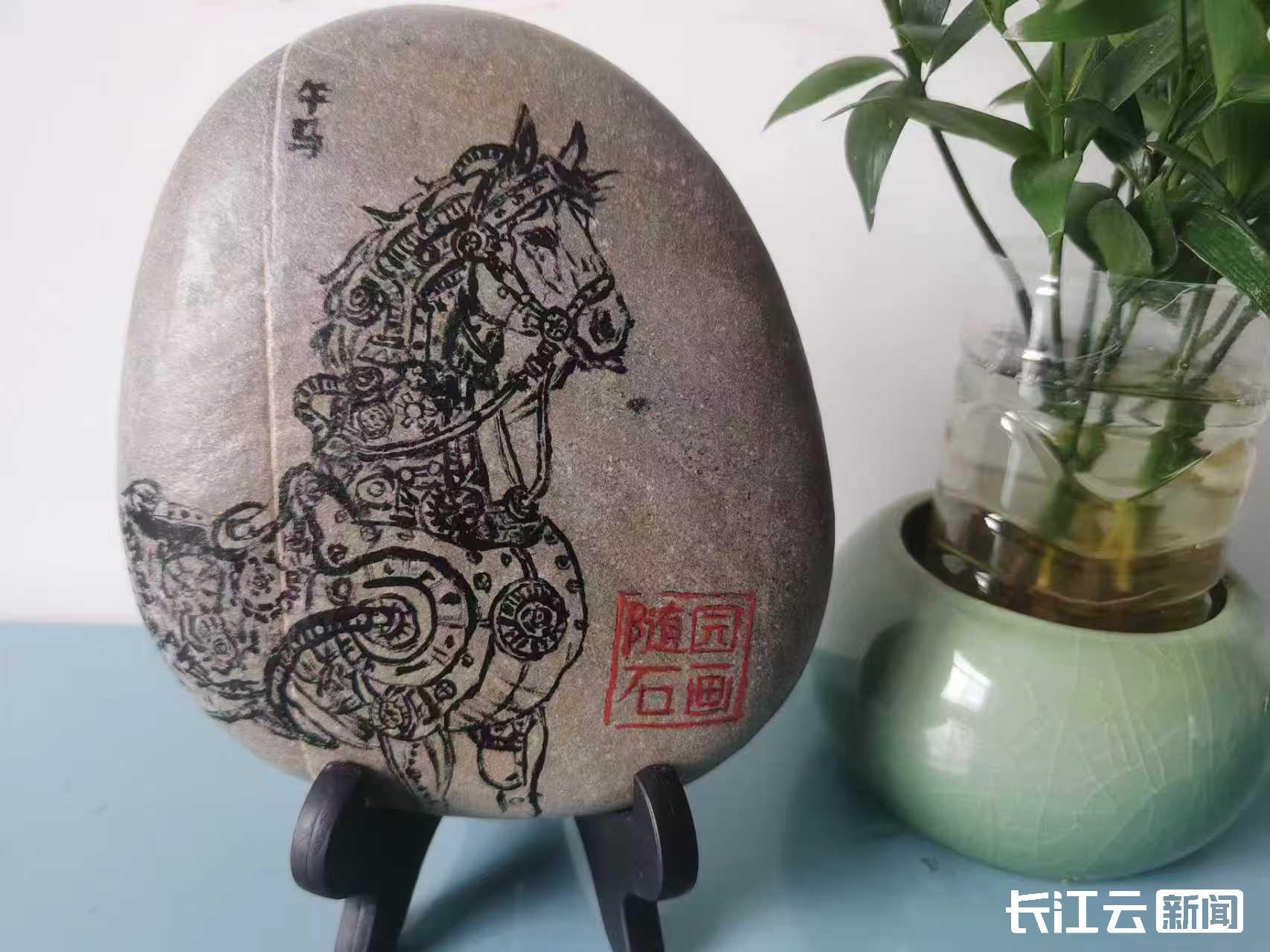 工作之余,他以“马”为主题潜心创作,近20幅素描、石头画、葫芦画等作品跃然眼前。笔下的骏马或奔腾驰骋,或昂首伫立,线条流畅、神态各异,普通的石头、瓦片、葫芦,在他的巧思勾勒下被赋予鲜活生命力。“‘牛马年好种田’,马年寓意着吉祥顺遂。”李明国笑着说,他想以自己最擅长的方式,传递“龙马精神”的昂扬斗志,也送上“马到成功”的美好祝愿。