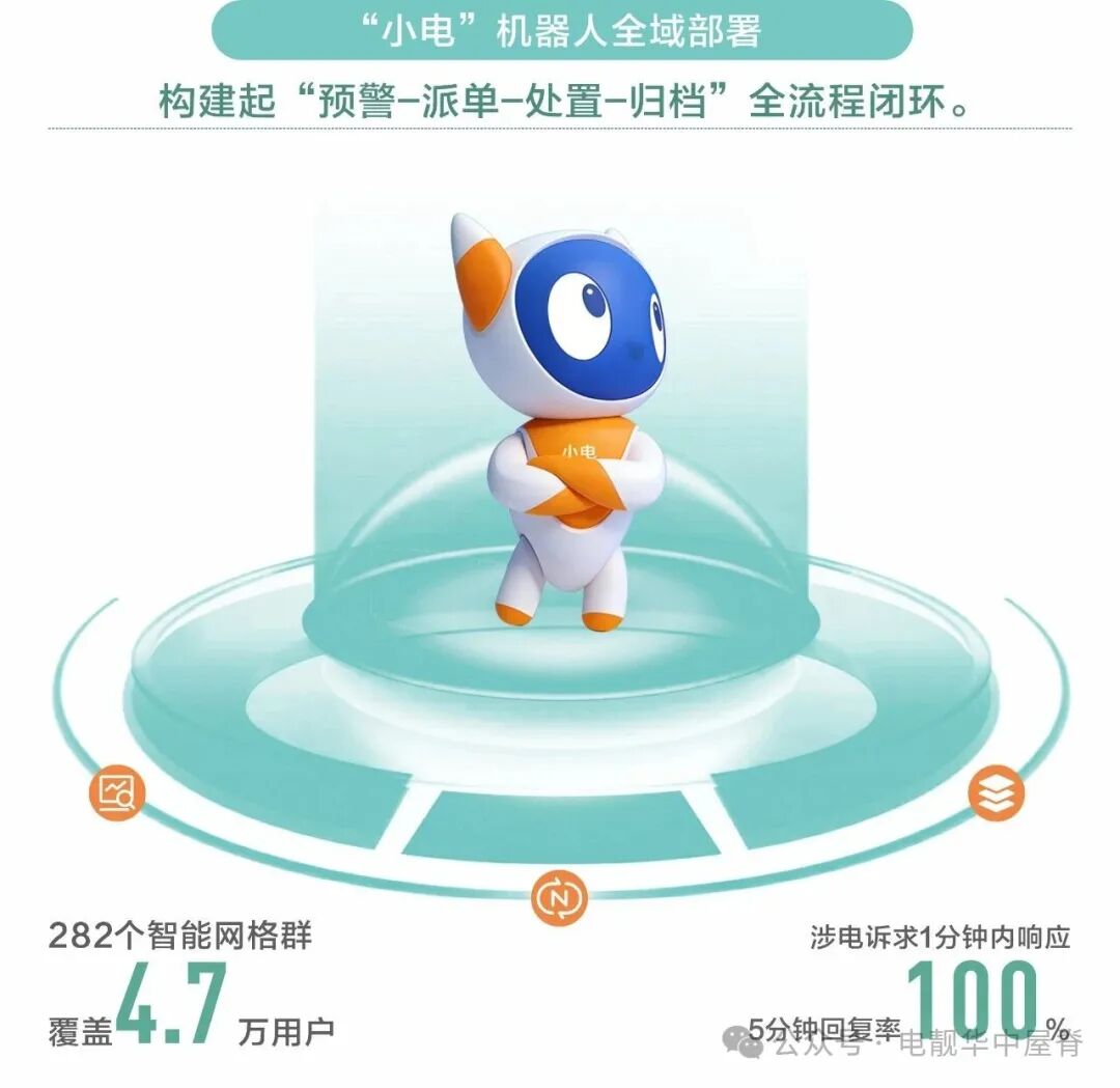 创新“气象+负荷”双预警系统,实现线路级、杆塔级精细化灾害预判,搭配“小电”机器人全域部署,282个智能网格群覆盖4.7万用户,涉电诉求1分钟内响应、5分钟回复率100%,构建起“预警-派单-处置-归档”全流程闭环。