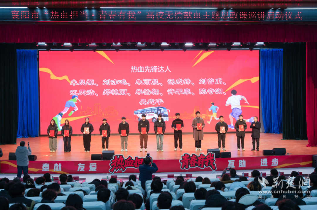 12月18日下午,襄阳市“热血担当·青春有我”高校无偿献血主题思政课巡讲启动仪式,在襄阳科技职业学院科技报告厅举行。现场,多名“热血英雄”分享“热血心路”,让“奉献、友爱、互助、进步”的志愿精神入脑入心。启动仪式由襄阳市卫生健康委、市教育局、市红十字会、市文明办、共青团襄阳市委联合主办,襄阳科技职业学院、襄阳职业技术学院、襄阳市中心血站承办,多所在襄高校协办。
