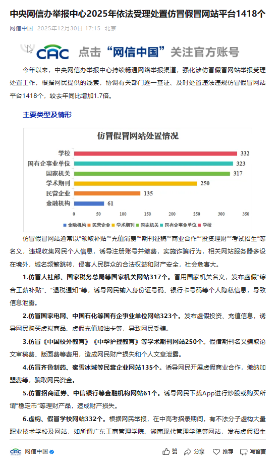 中央网信办举报中心2025年依法受理处置仿冒假冒网站平台1418个