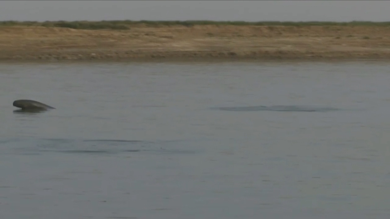 江西省余干县鄱阳湖湿地生态保护中心江豚巡护队队长袁文斌:有两头,看到了吧?--对对,就在那。--对,嗯江豚,它马上要浮出来,这里,这里,看到了吧?看到了吧?