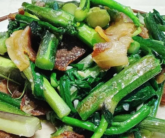 红菜苔,又叫紫菜苔,色泽紫红,嫩菜秆口感脆嫩清甜,适合清炒、炒肉、煲汤。对于湖北人来说,红菜苔与腊肉堪称绝配。红菜苔炒腊肉的做法很简单,家家户户都会做,最好选用霜降后的红菜苔,先把腊肉切成薄片,下锅炒出油脂,再放葱姜蒜、小米辣炒出香味,最后放入红菜苔大火翻炒,加食盐、生抽、鸡精调味即可。