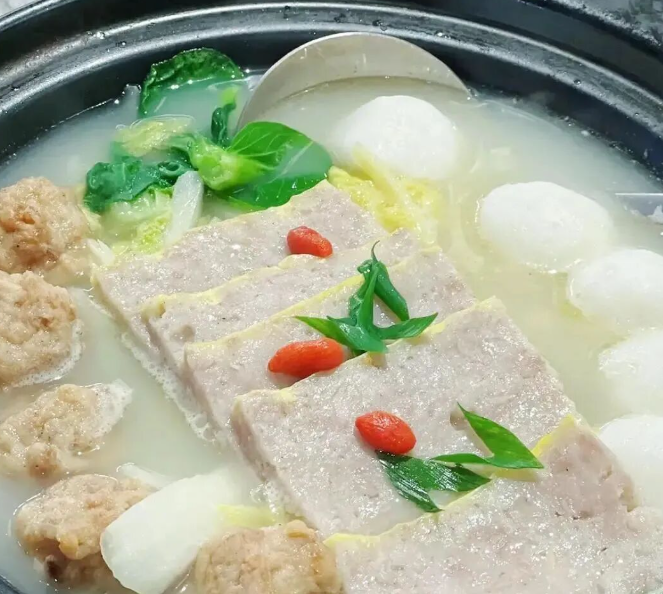 黄陂三鲜,又叫黄陂三合,是武汉黄陂区家喻户晓的传统名菜,是逢年过节、重要宴席必不可少的菜肴,不仅味道鲜美,而且还有很吉祥的寓意。黄陂三鲜以鱼圆、肉圆、肉糕等三种食材为主料,鱼圆要用新鲜的鱼肉打成肉泥,加食盐、淀粉、蛋清等搅拌上劲,再下锅煮制而成,肉圆、肉糕要以猪腿肉为主料,剁成肉末,再加入鱼茸,搅拌均匀,制作而成。三种食材烩在一起,鲜美异常,风味独特,汤鲜肉嫩,值得一试。
