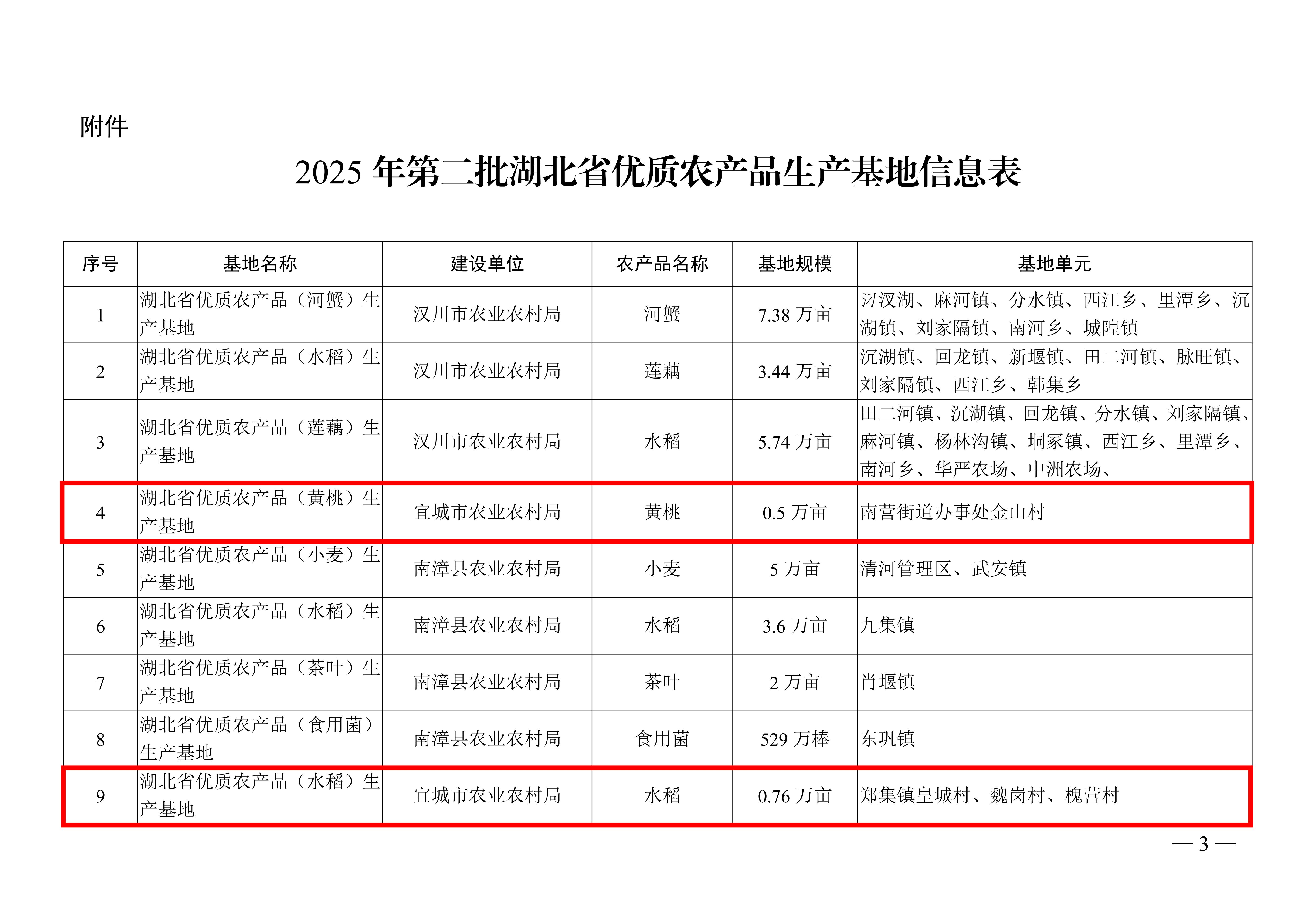 近日,湖北省农业农村厅公布2025年第二批湖北省优质农产品生产基地名单,宜城市申报的“湖北省优质农产品(黄桃)生产基地”和“湖北省优质农产品(水稻)生产基地”成功入选,为当地现代农业高质量发展再添两张省级“金名片”。