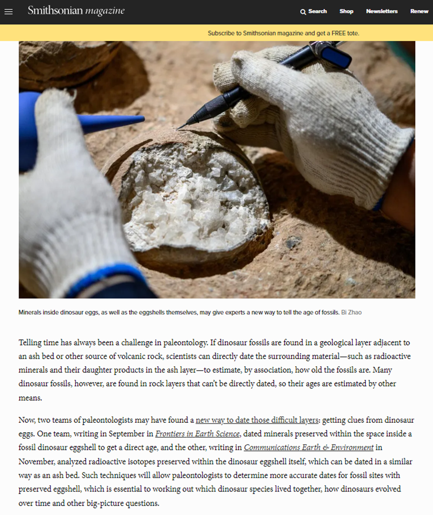 近日,全球规模最大的博物馆群和研究中心——史密森尼学会在其官方刊物《Smithsonian magazine》发布“2025 年全球十大恐龙发现”榜单,中国湖北十堰郧阳青龙山恐龙蛋年代学研究成果成功入选,位列第三。该成果以“恐龙蛋化石为确定古老遗址的年代提供新方法”为核心突破,为古生物学测年领域带来革命性思路。