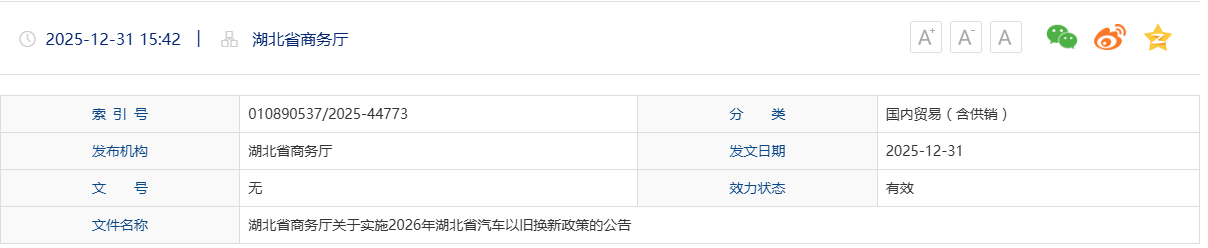 为贯彻落实《商务部等7部门关于提质增效实施2026年消费品以旧换新政策的通知》(商消费函〔2025〕697号)精神,按照《商务部等8部门办公厅关于印发〈2026年汽车以旧换新补贴实施细则〉的通知》(商办消费函〔2025〕467号)要求,湖北省将于2026年1月1日起实施2026年汽车以旧换新政策,接续开展汽车以旧换新补贴活动。请广大消费者及汽车以旧换新活动参与企业及时关注湖北省2026年汽车以旧换新补贴实施细则发布实施。