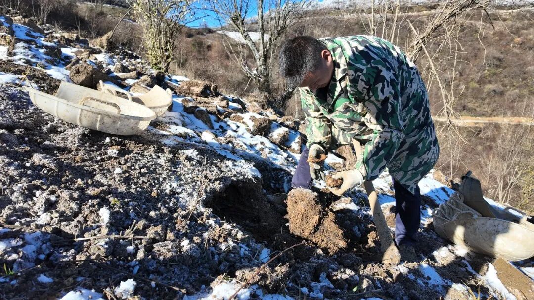 ▲天麻采挖季,周成兵帮村民挖天麻赚务工费