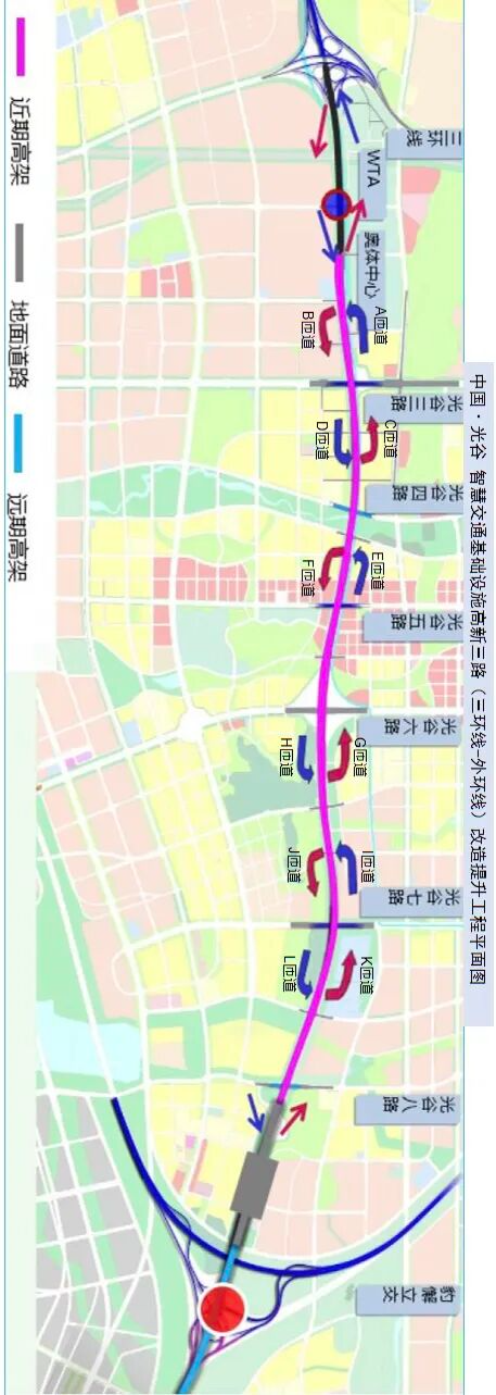 高新三路(三环线-外环线)改造提升工程起于三环线武黄立交,东至新武东收费站,规划道路全长约10.7公里,采用“主线高架6车道+地面道路6车道”设计。其中高架快速路8.23公里,设计时速80公里。