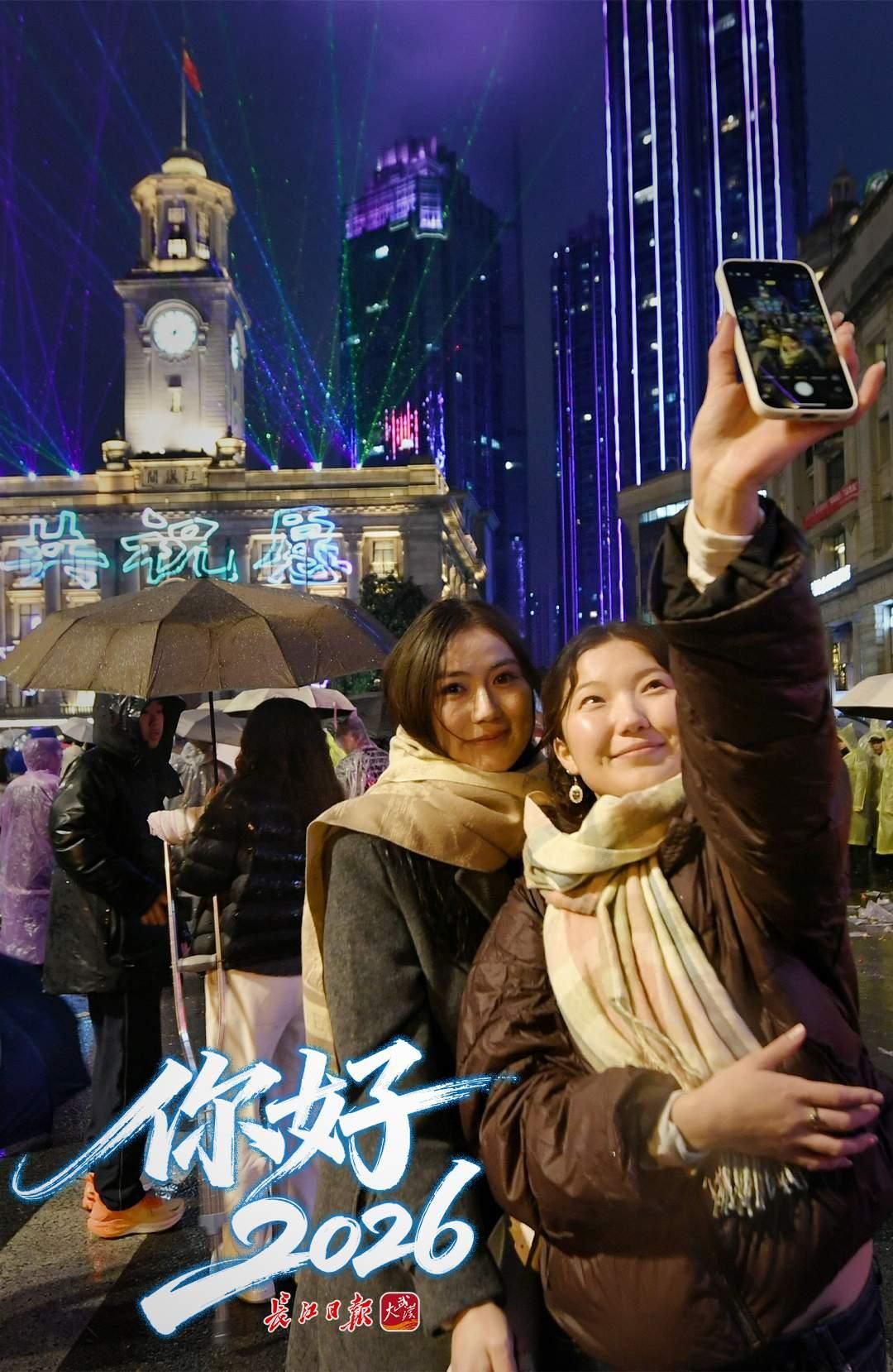 2025年12月31日晚,“你好,2026”江汉关跨年光影秀在江汉关广场举行,年轻人举着手机自拍。 长江日报记者史伟 摄
