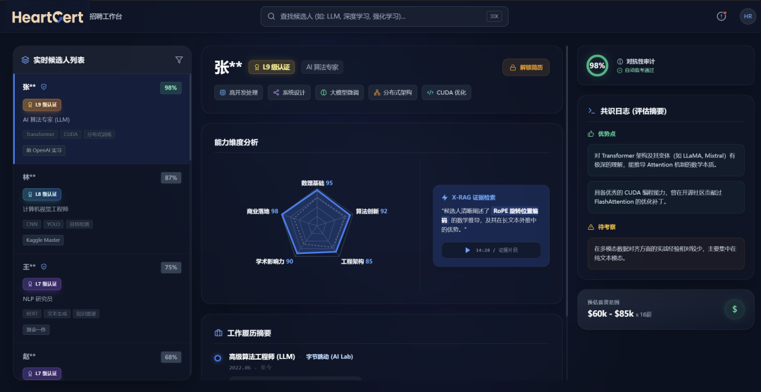 关注到当下求职者“就业难”与企业“招人难”的供需错配与能力脱节问题,他带领一支由华中科技大学、北京大学、中国科学技术大学及美国西北大学博士专家与顶尖学子组成、平均年龄仅20岁的“极客军团”,在光谷成立了归心科技,自主研发出一款X-RAG多模态实战考核引擎——HeartCert(归心认证),利用AI对求职者进行审核和面试,并与企业所需的空缺职位进行匹配。