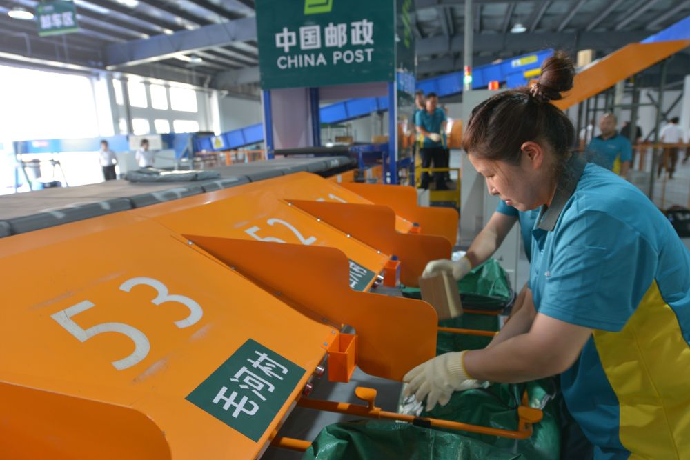 在应城市寄递物流共配中心分拣机旁,工作人员正在检查包裹。新华社发
