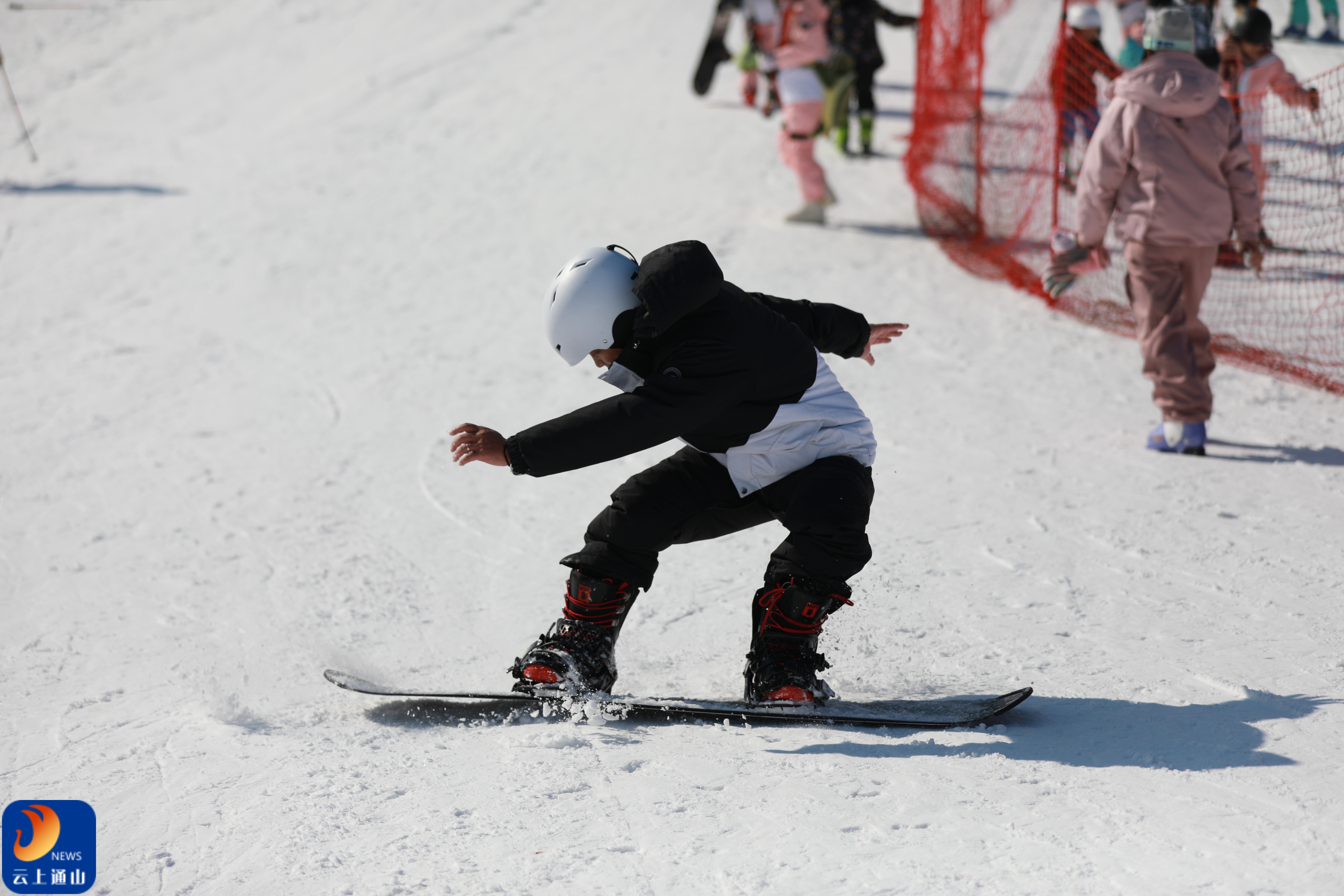 ▲滑雪板在空中划出优美帅气的弧线,孩童的欢笑声在松林间回荡,为寒肃的场子平添了许多人气。