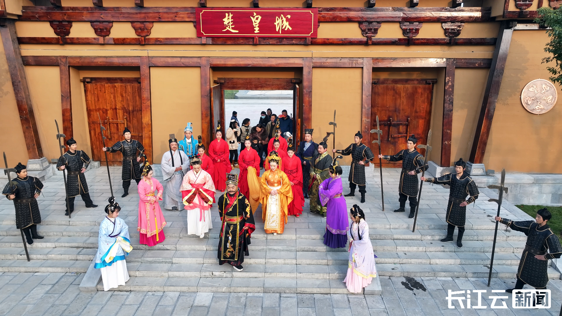在楚皇城大遗址保护开发项目现场,演员们身着华丽古装,将“楚庄王”巡游的盛大场景搬上舞台,上演了一场跨越千年的古今文化对话。在全副武装士兵的护卫下,“楚庄王”游览楚皇城,并与现场游客和广大群众挥手致意。在一个个互动中,现场氛围被推向高潮,大家纷纷掏出手机,与“楚庄王”合影留念,拍下精彩瞬间。