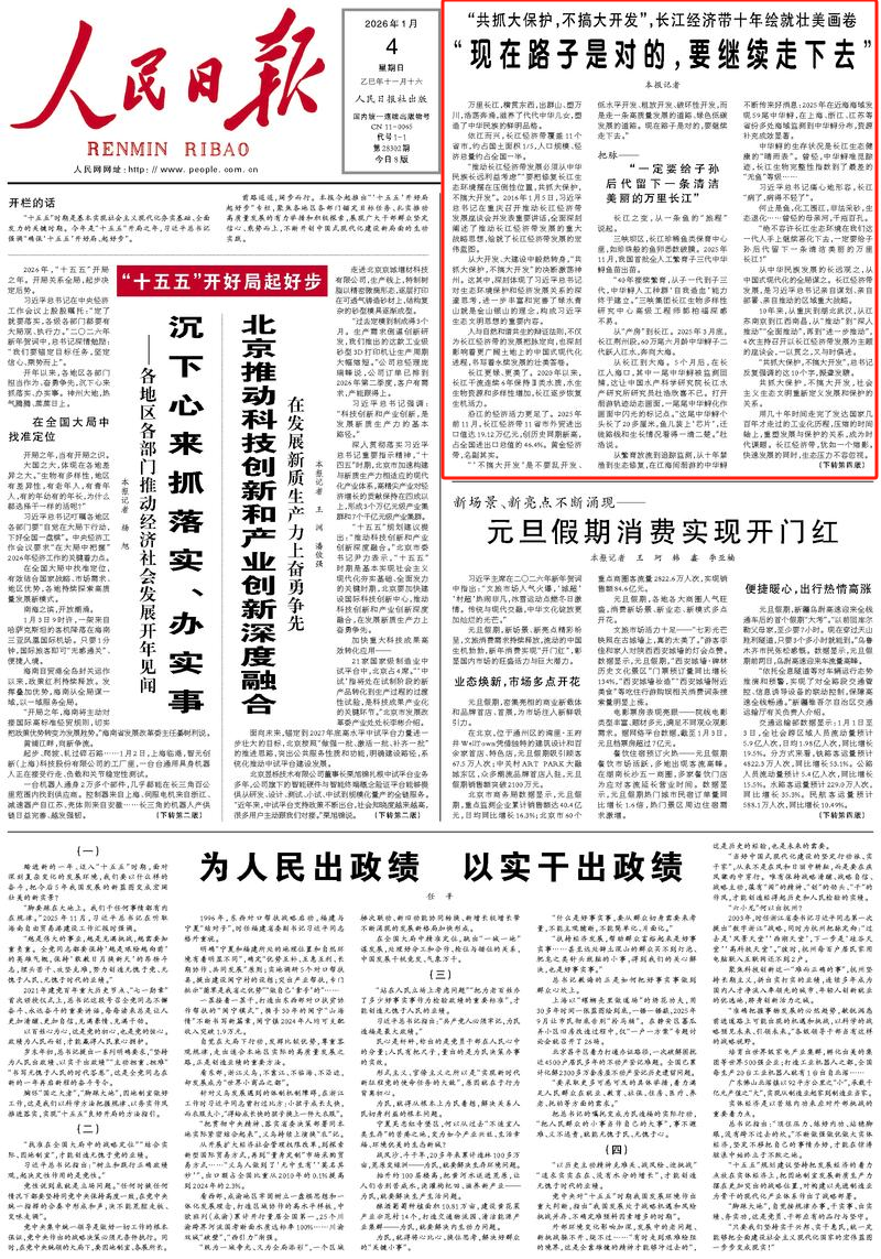 1月4日,《人民日报》头版刊文《“现在路子是对的,要继续走下去”》关注长江经济带发展。