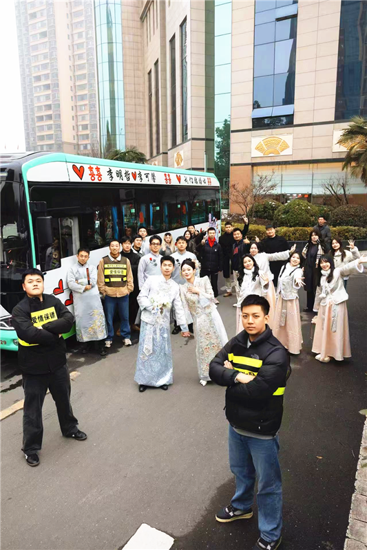 李明哲和李可馨的公交婚车从东方国际酒店出发,前往举办婚礼的洪源大酒店,行驶在路上,瞬间吸引了众多路人的目光。大家纷纷停下脚步,驻足围观,目光中满是惊喜与祝福。不少人拿出手机,记录下这浪漫又特别的瞬间,还有路人对着婚车大声喊出对新人的美好祝愿。