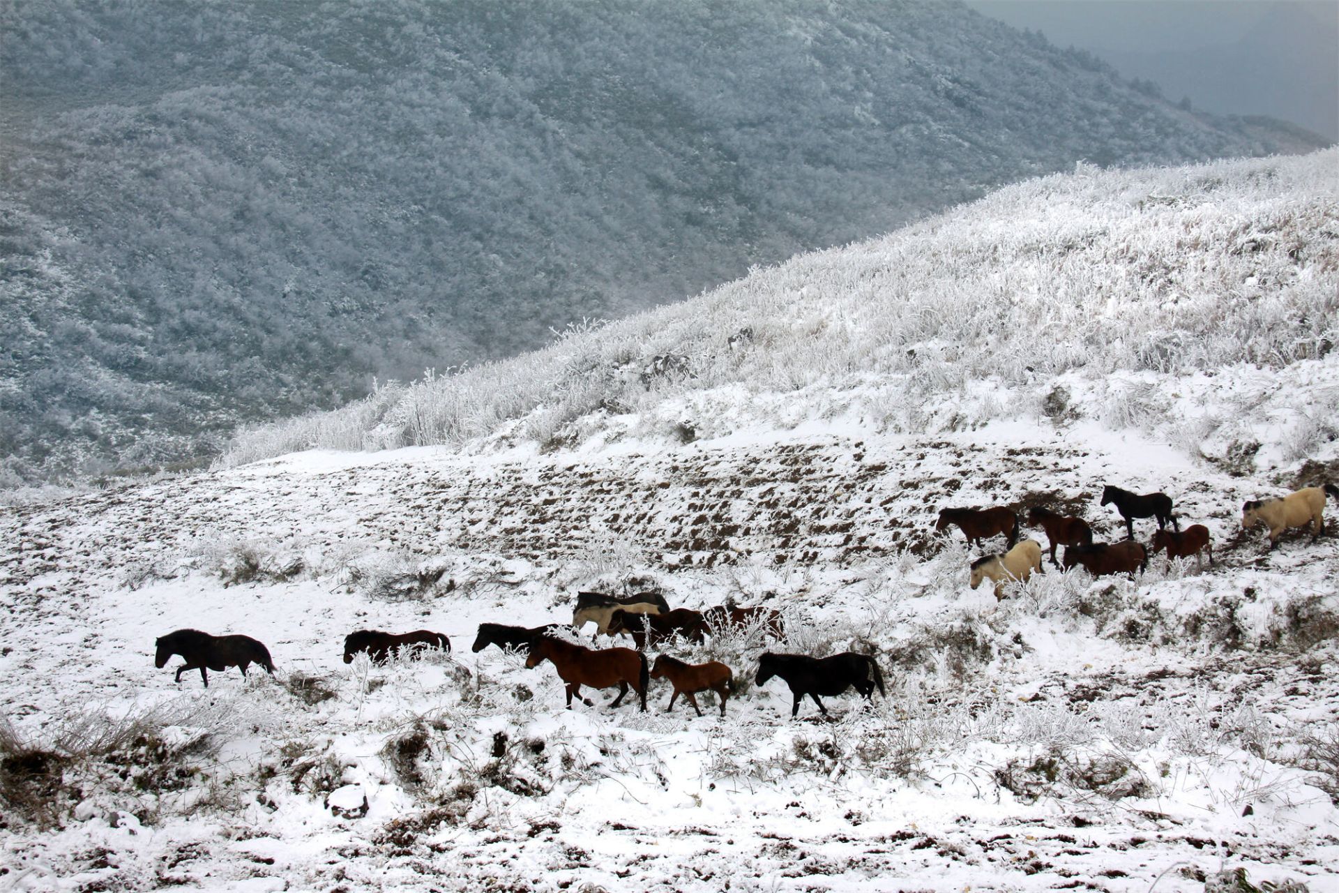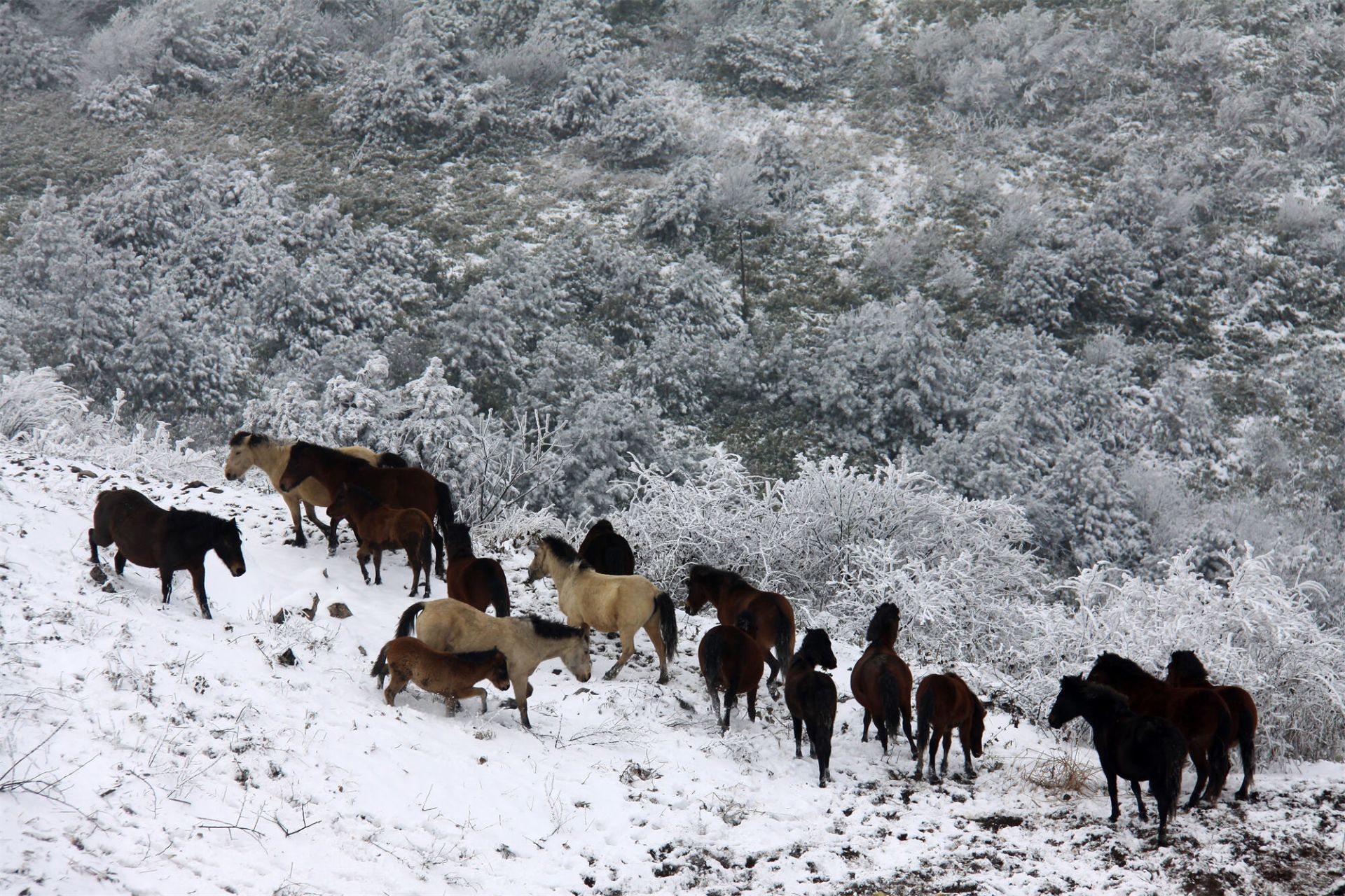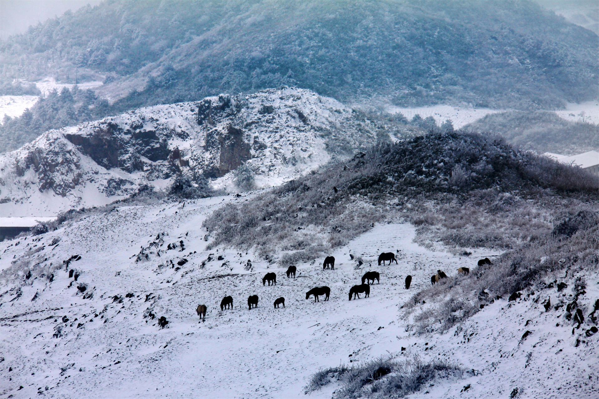 雪是齐岳山的常客,却从没有哪一次,像这般应景。恰逢马年将至,天地间的留白里,便多了灵动的主角——那群散落在雪原上的马儿。它们没有躲进避风的棚圈,依旧循着千百年来的习性,在茫茫雪野里自由放牧。深一脚浅一脚的蹄印,像是在素帛上落笔的诗行,从山脚蜿蜒到山巅,把寂静的雪原,踩出了勃勃生机。