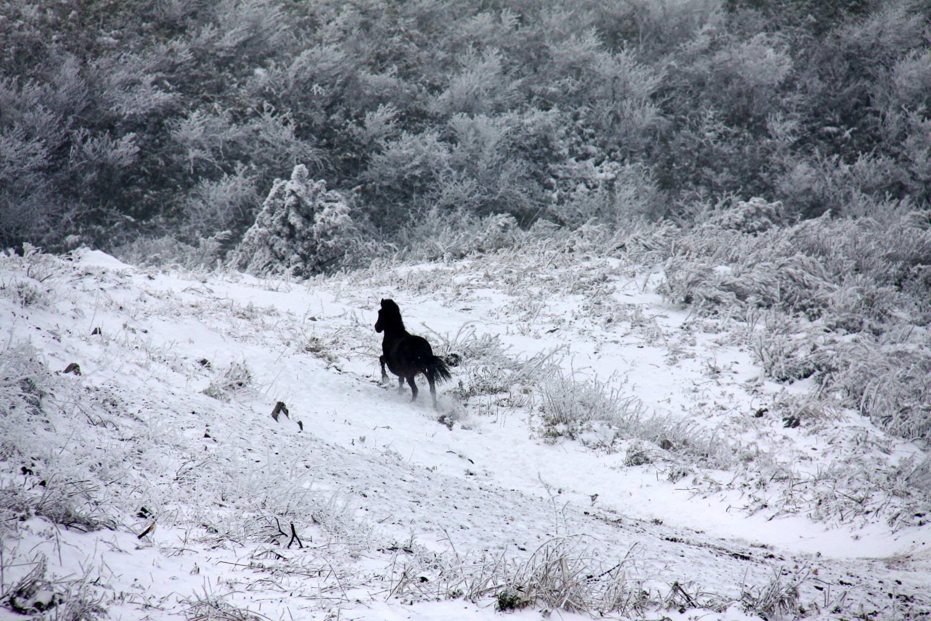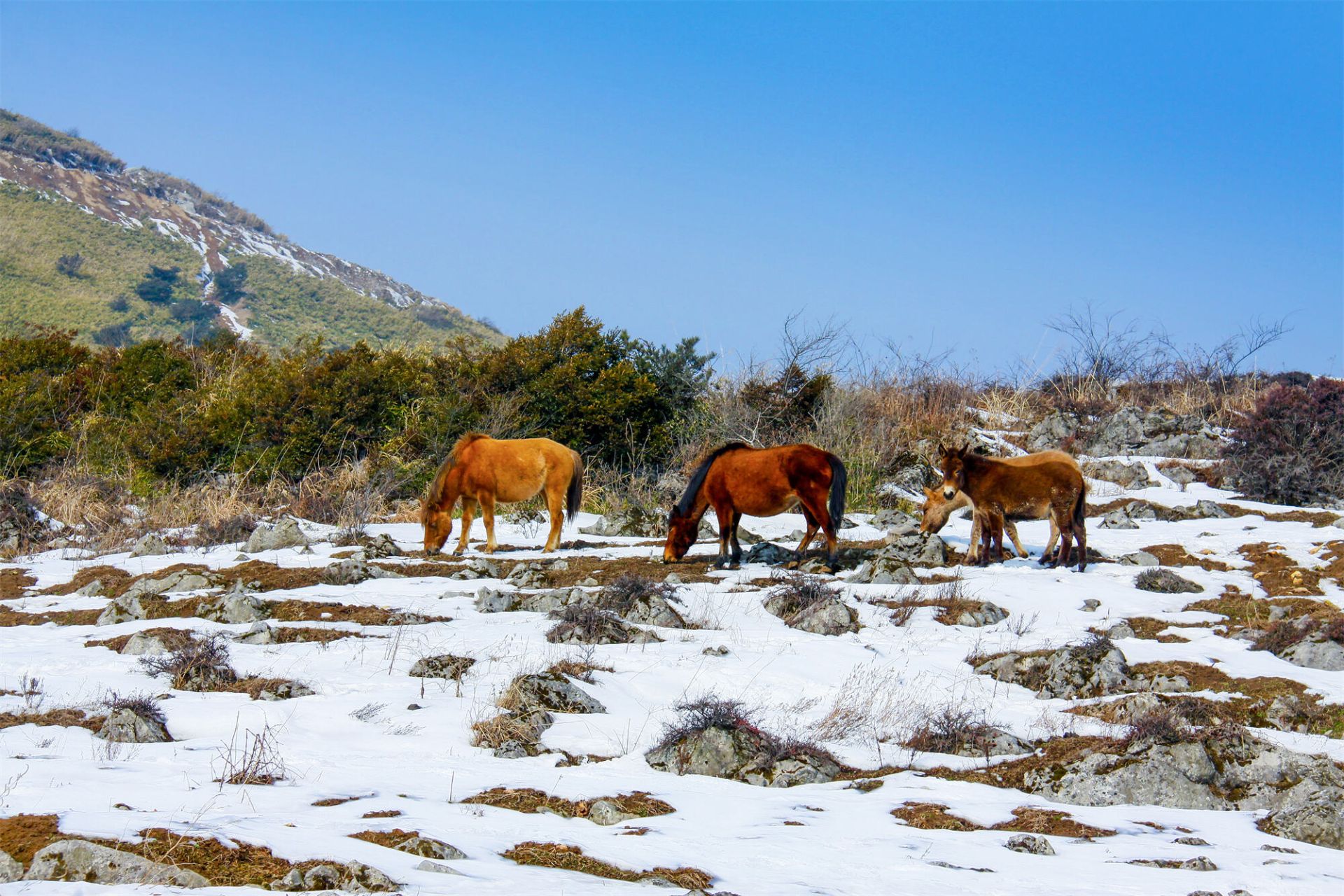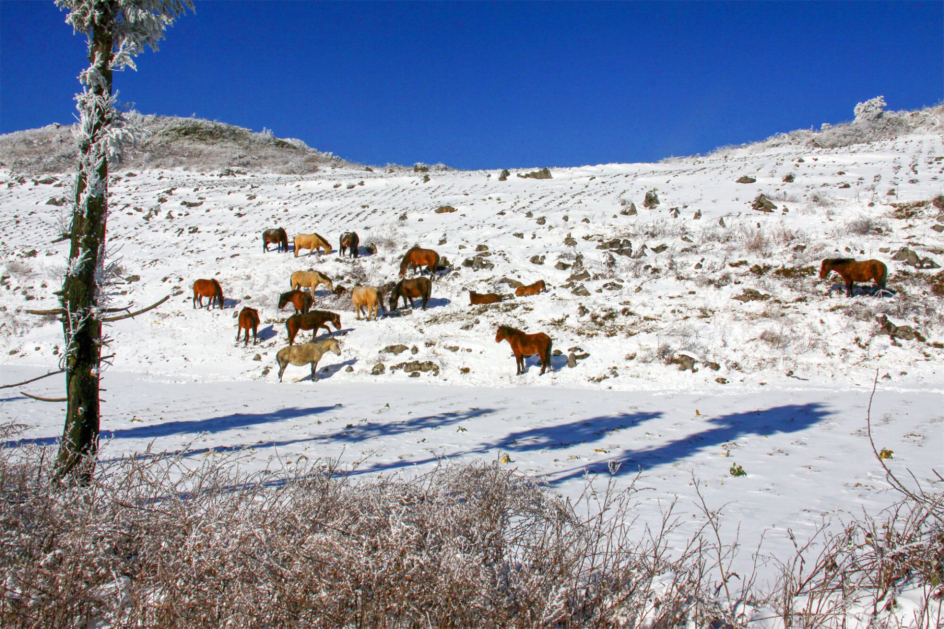 雪是齐岳山的常客,却从没有哪一次,像这般应景。恰逢马年将至,天地间的留白里,便多了灵动的主角——那群散落在雪原上的马儿。它们没有躲进避风的棚圈,依旧循着千百年来的习性,在茫茫雪野里自由放牧。深一脚浅一脚的蹄印,像是在素帛上落笔的诗行,从山脚蜿蜒到山巅,把寂静的雪原,踩出了勃勃生机。