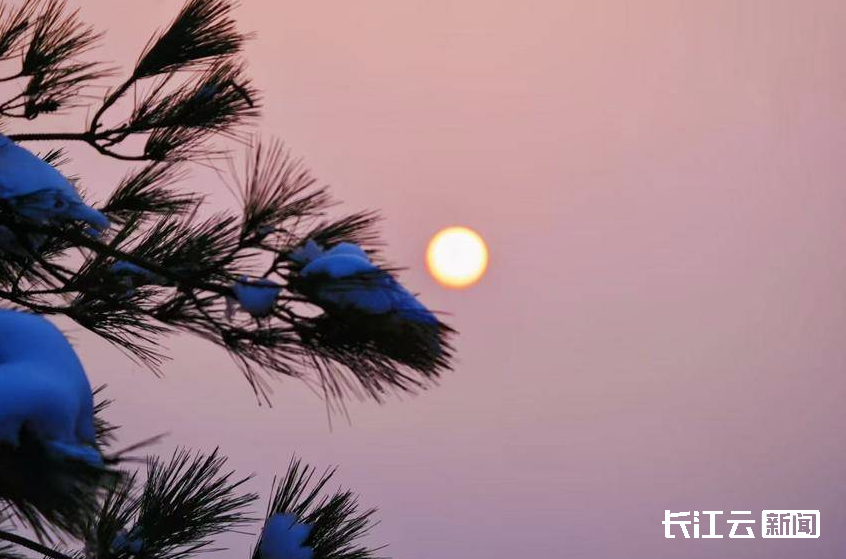 低垂的落日,透着冬日特有的温润与宁静。绚烂的橘红色霞光浸染了西边的天际,为冰冷的雪世界注入一抹暖意。落日的位置随着观者移步而变幻无穷,时而仿佛坠在挂满冰凌的苍劲松树梢头、时而恰好镶嵌在仙人峰顶,为挺拔的山峰勾勒出一圈璀璨的金边。