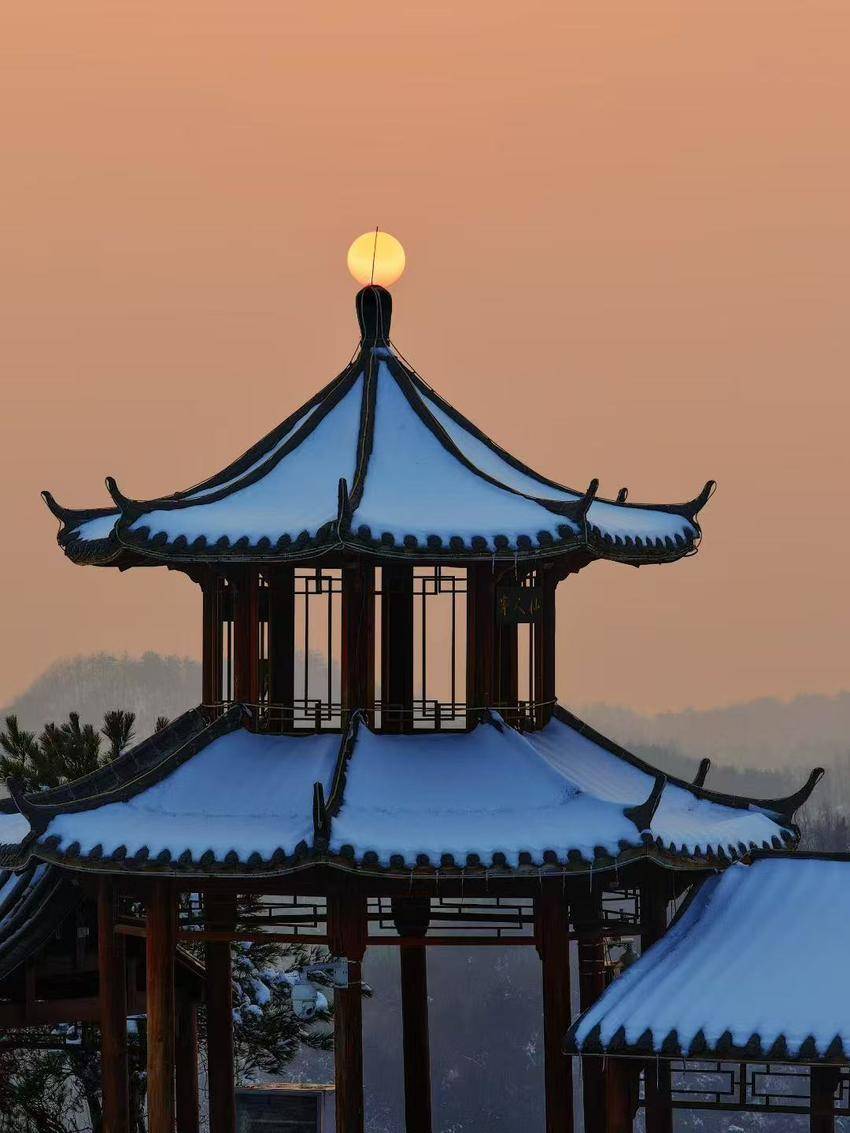 山间点缀的亭台,此刻也悄然换装,厚重的积雪覆盖着飞檐翘角,仿佛为其披上了一件洁白蓬松的冬衣,于素雅的水墨底色中平添几分古朴与静谧。