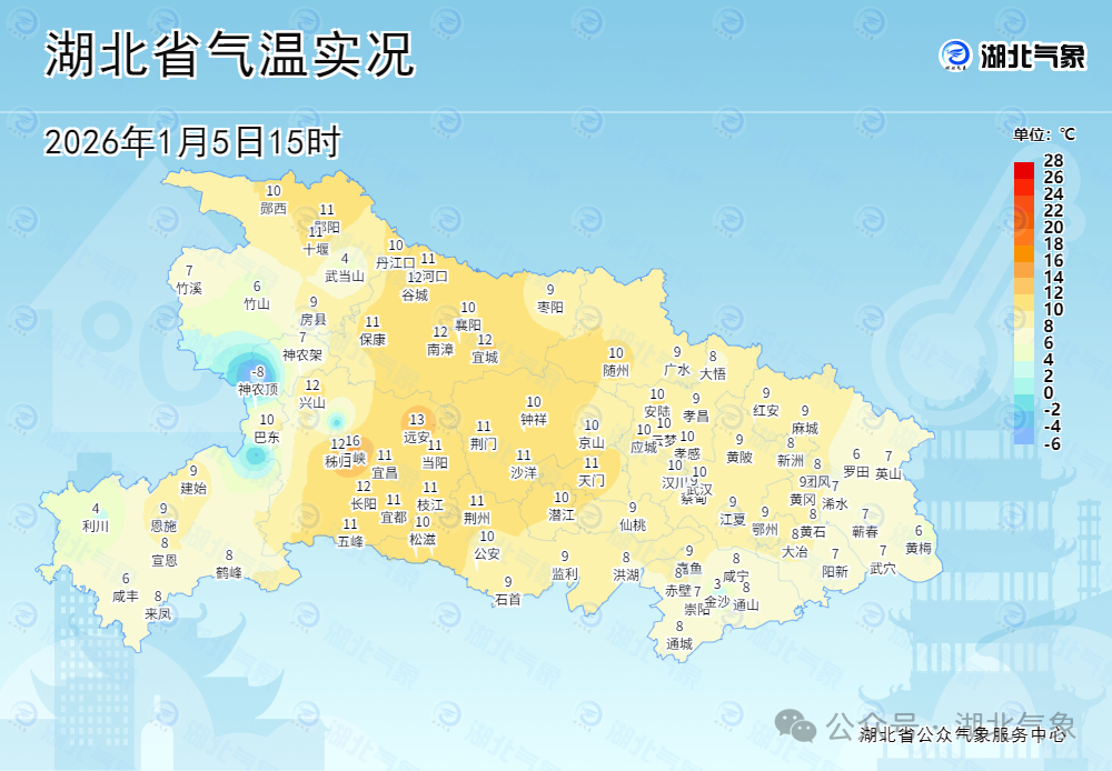 温馨提示:本周湖北以晴或多云天气为主,适宜晾晒。最高气温逐日缓慢回升,但最低气温仍维持较低水平,昼夜温差大,公众需注意保暖和用火、用电、用气安全,老年人可适当推迟晨练时间。