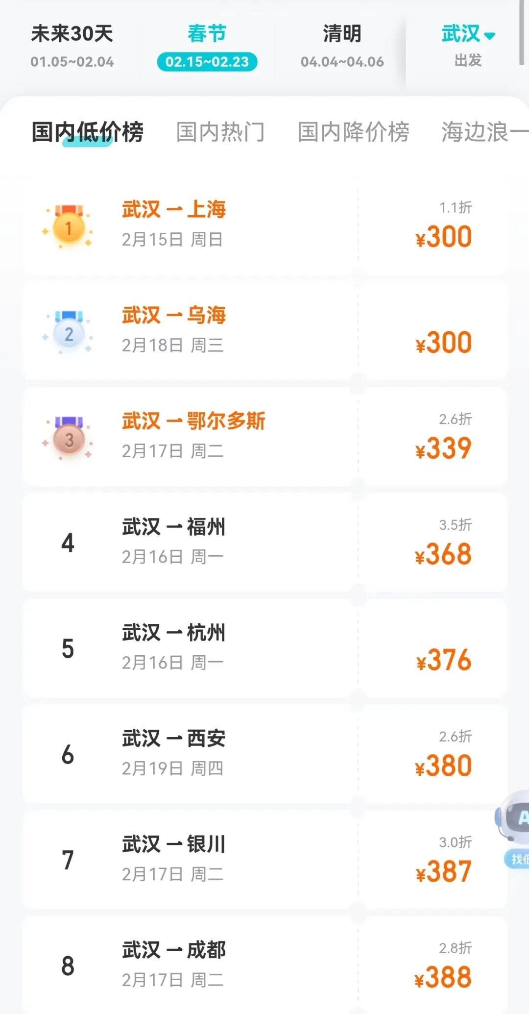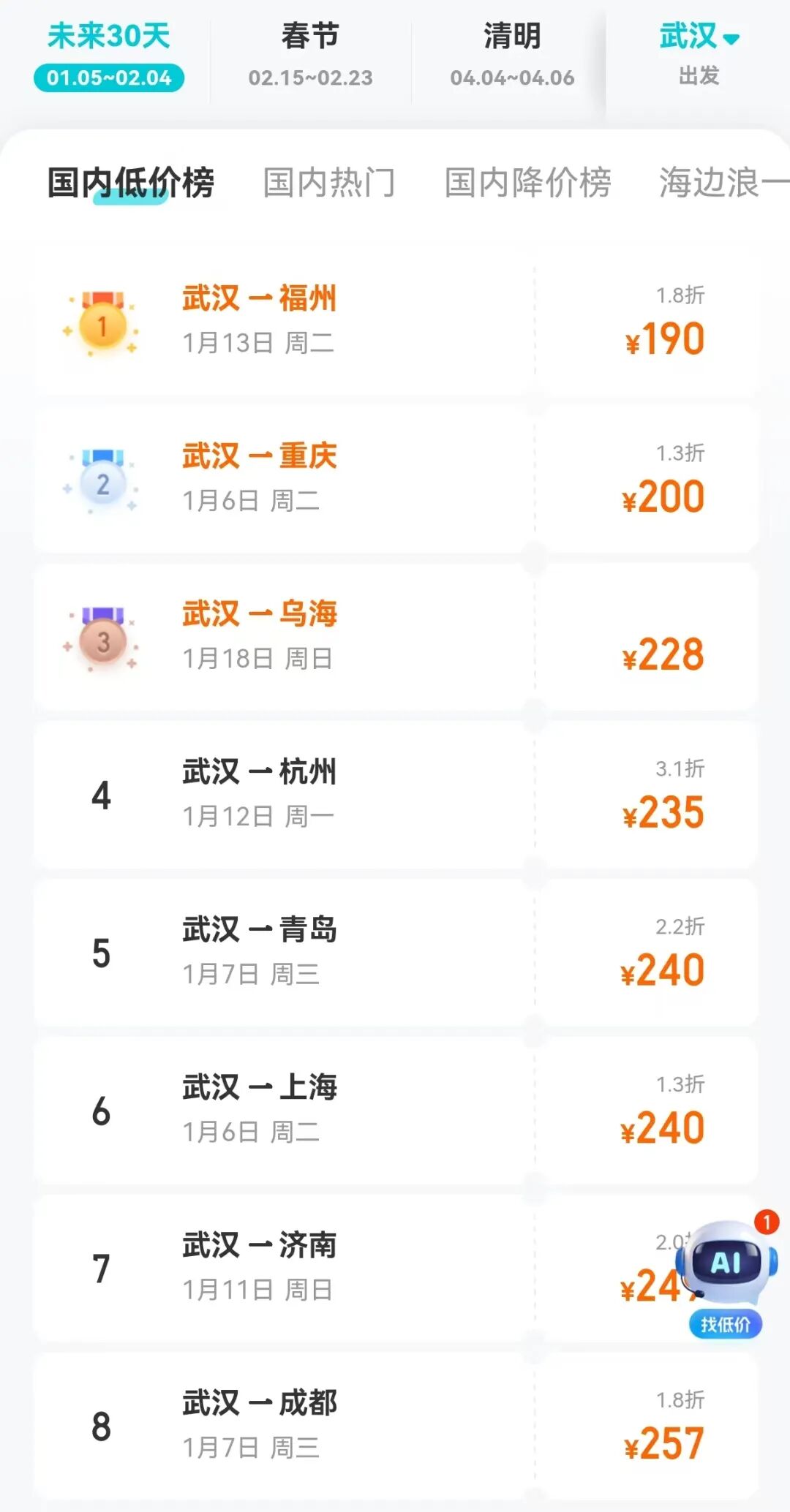 记者查询第三方售票平台注意到,近期从武汉出发去往多个城市的机票价格低至“1”字头,例如明天(6日)武汉至上海低至1.3折,仅需240元;1月7日,武汉至青岛航班低至2.2折,仅需240元;1月13日,武汉至福州航班低至1.8折,仅需190元;正是错峰出游好时机。