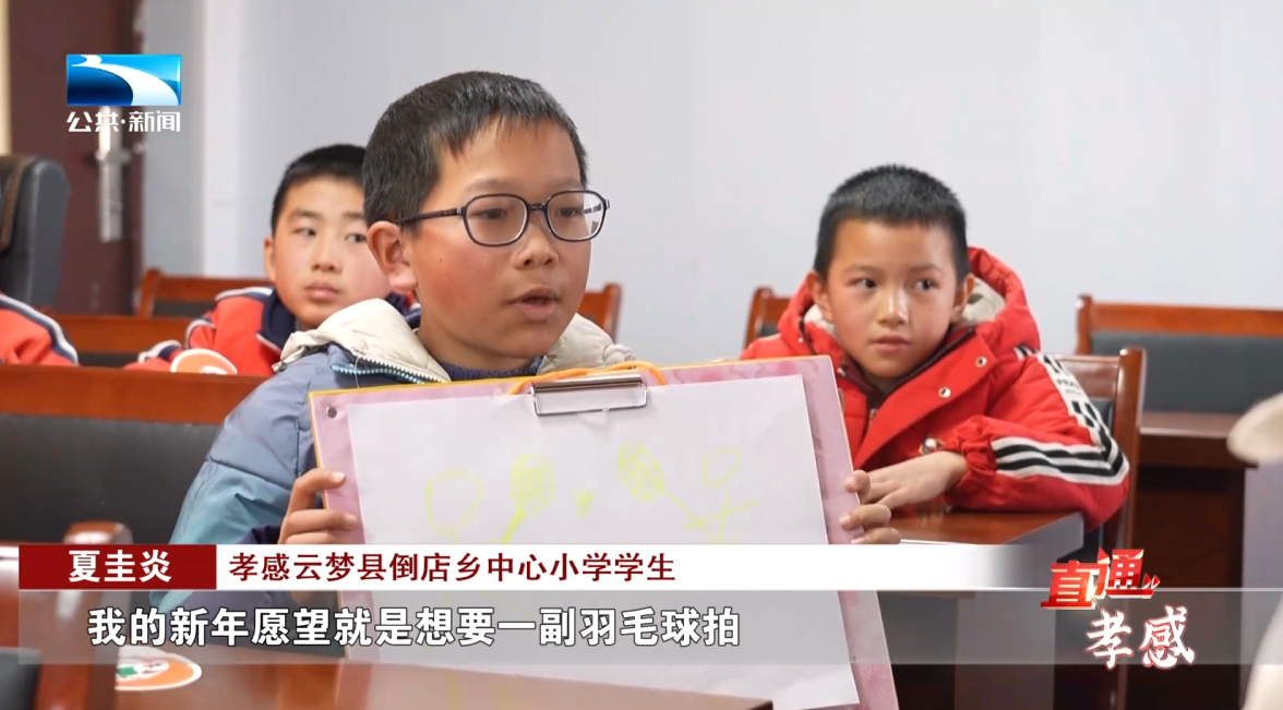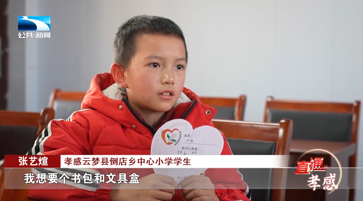 孝感云梦县倒店乡中心小学学生 张艺煊:我的新年愿望是,我想要个书包和文具盒,因为我的书包和文具盒都坏掉了,我想换个新的。
