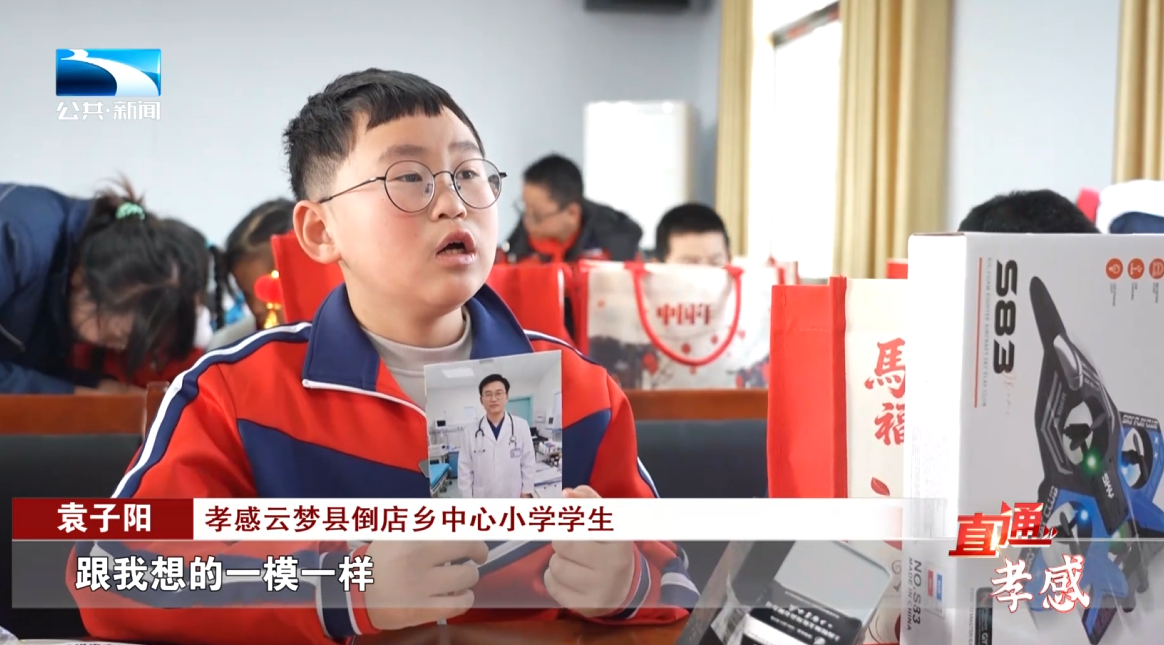 孝感云梦县倒店乡中心小学学生 袁子阳:看,这就是“长大后的我”,穿着白大褂,还有听诊器,跟我想的一模一样,原来我长大之后真的可以变成这个样子。我要把这张照片贴在床头,继续向这个方向努力。