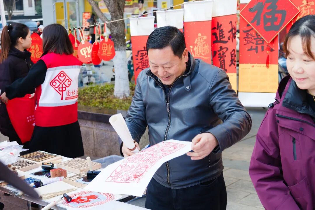 活动现场,居民们热情参与,感受十足的年味与暖意。“没想到在家门口不仅能拿到书法家手写的春联,还能顺便把地道的年货置办上,感觉提前过年了!”刚选购了炸圆子的社区居民李阿姨高兴地展示着手中墨迹未干的福字,“这个‘福’字写得真好,这个活动真贴心,既有文化味儿,又实在。”带着孩子前来参加活动的王先生则表示:“活动很丰富,孩子看了写毛笔字,也尝了传统小吃,感觉特别有意义。”