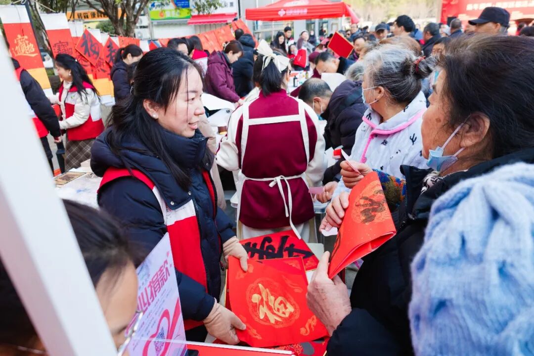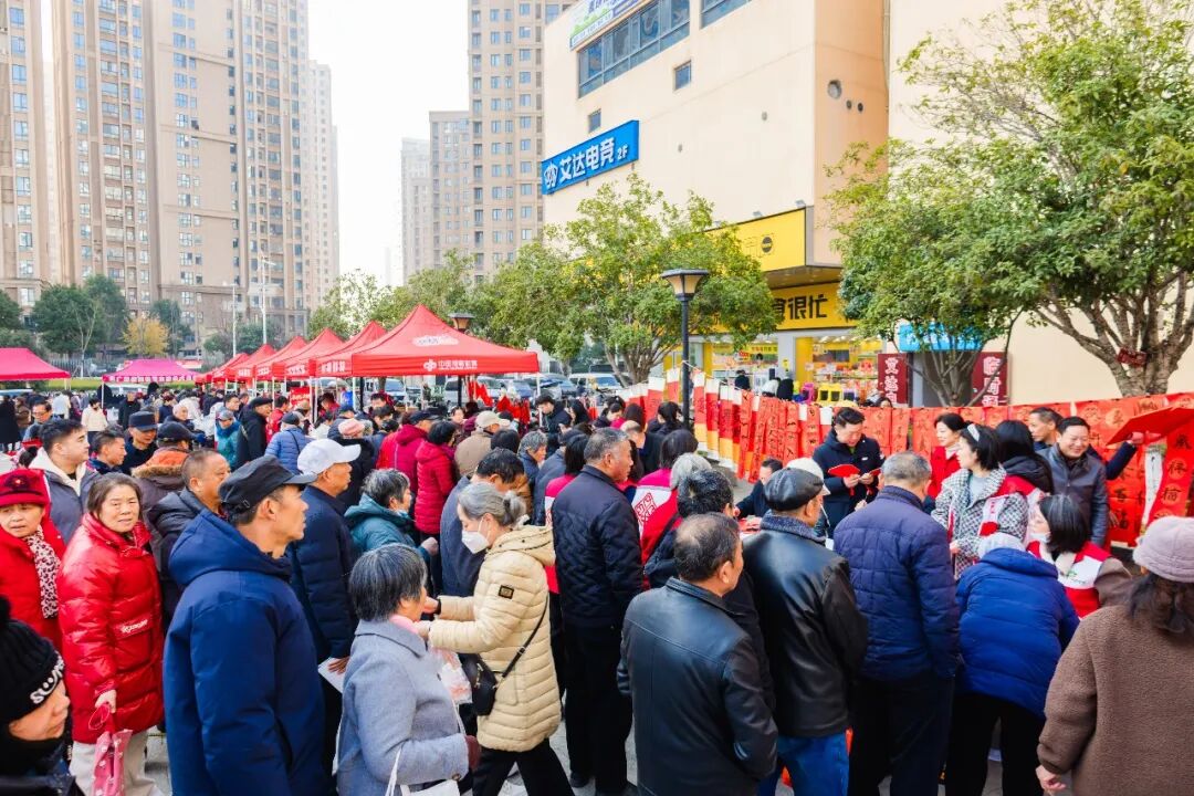 活动现场,翰墨飘香与年货香味交织,洋溢着一片喜庆祥和的节日氛围。银龄艺术家们展纸挥毫,笔走龙蛇,一副副寓意吉祥的春联、一个个饱满的“福”字在他们手中诞生,传递着对新春的美好祈愿。与此同时,位于社区广场的年货节摊位也热闹开市,琳琅满目的传统年货吸引众多居民驻足。熏制入味的腊肉、现炸金黄的圆子与藕夹散发出阵阵诱人香气,勾勒出浓厚的荆楚年味,让公益活动的温暖与市井生活的烟火气完美融合。