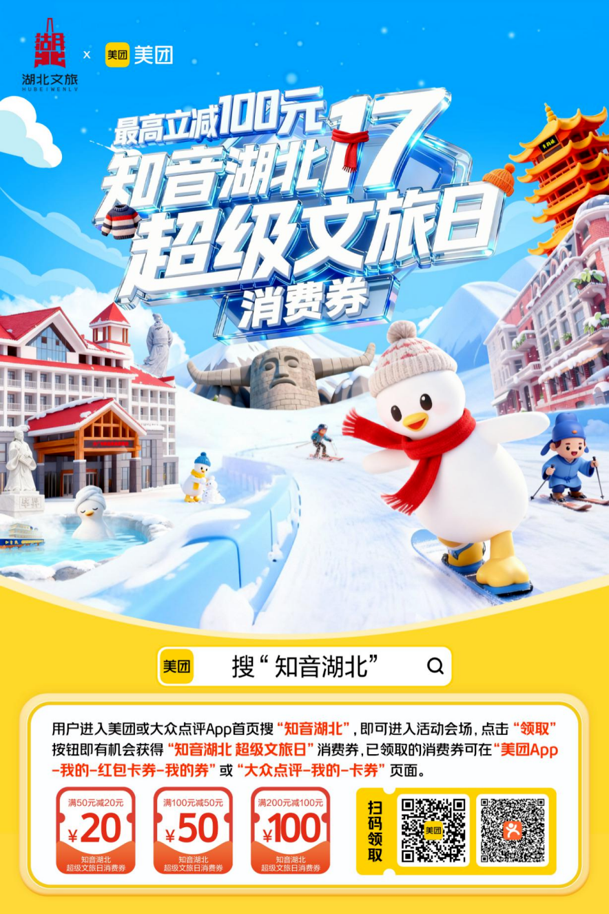 用户进入美团或大众点评App首页搜“知音湖北”,即可进入活动会场,点击“领取”按钮即有机会获得“知音湖北 超级文旅日”消费券,已领取的消费券可在“美团App-我的-红包卡券-我的券”或“大众点评-我的-卡券”页面。