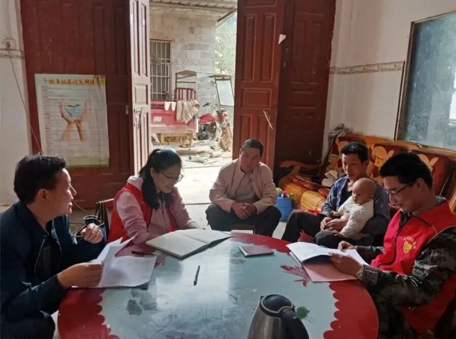 黄文秀(左二)生前下乡走访贫困户(资料图)。新华社发