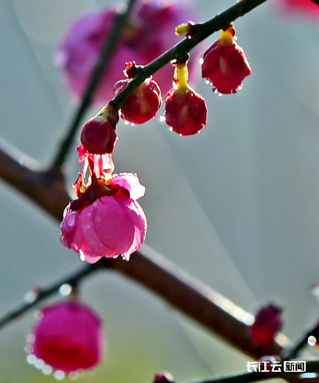 先醒的是几点红——并非盛极的霞,倒像冬眠的泥土,呵出的第一口温热气血。它们初燃在疏枝上,每一朵都选了最恰当的枝头:有的已半开,薄瓣如绡,承着夜露结成的细碎星子,光一照,便成了琉璃盏;更多的,仍是紧裹的蕾,尖儿上那抹红意,是刚蘸饱了胭脂的笔锋,将触未触。它们悬在那里,像一句句欲言又止的花信,只待东风再暖半分,便要倾吐满腹的芬芳。