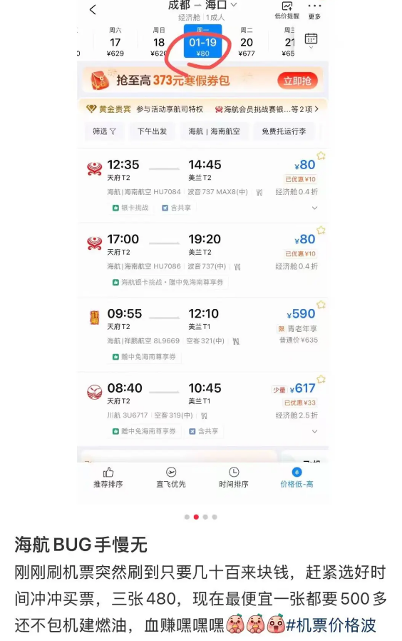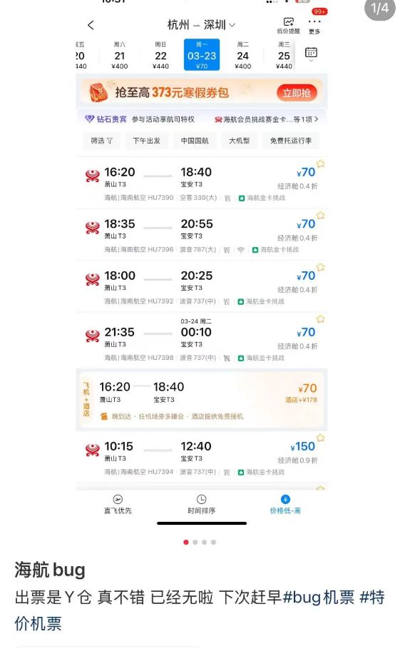 1月9日上午,在社交平台有部分网友发文称,海航机票出现bug,部分热门航线机票价低至几十元,如杭州到深圳的经济舱机票价只有0.4折70元,广州到北京的机票也只需100多元。