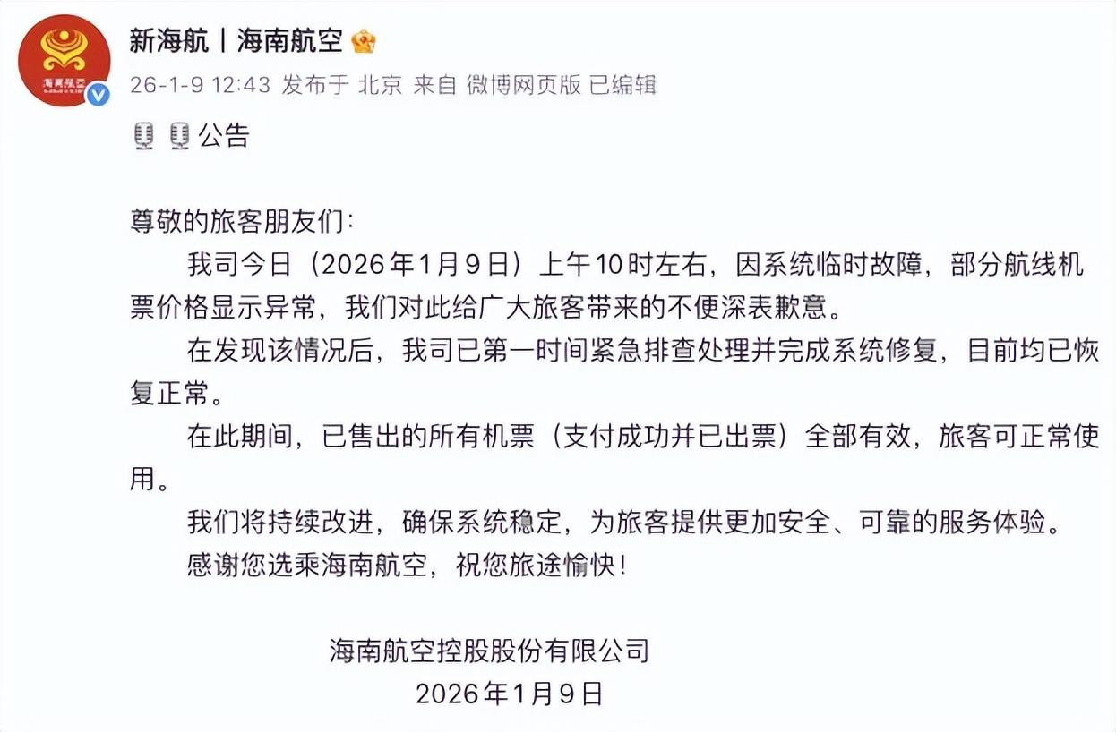 对此,海南航空官微午间发公告称,9日上午10时左右,因系统临时故障,部分航线机票价格显示异常,对此给广大旅客带来的不便深表歉意。在发现该情况后,公司已第一时间紧急排查处理并完成系统修复,目前均已恢复正常。在此期间,已售出的所有机票(支付成功并已出票)全部有效,旅客可正常使用。
