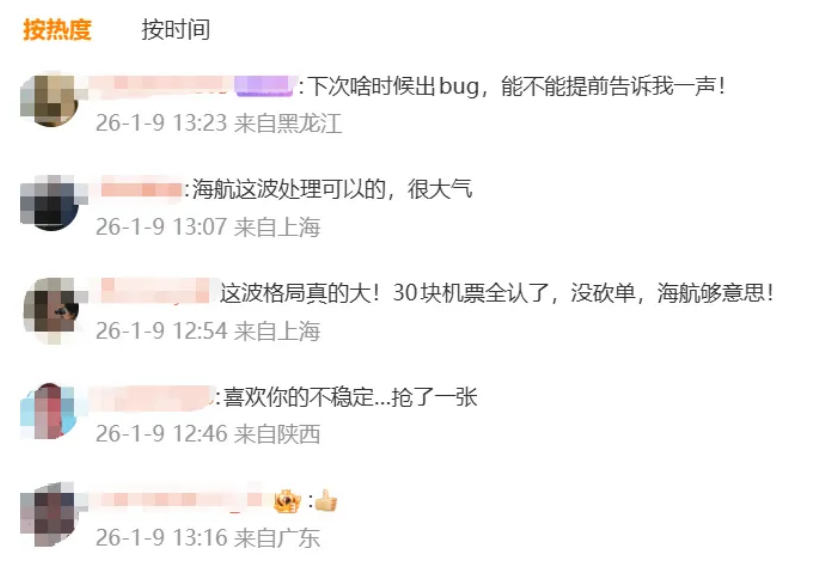 在该条公告评论区,有网友表示,“海航这波处理很大气”“30块钱机票全认了,够意思”。