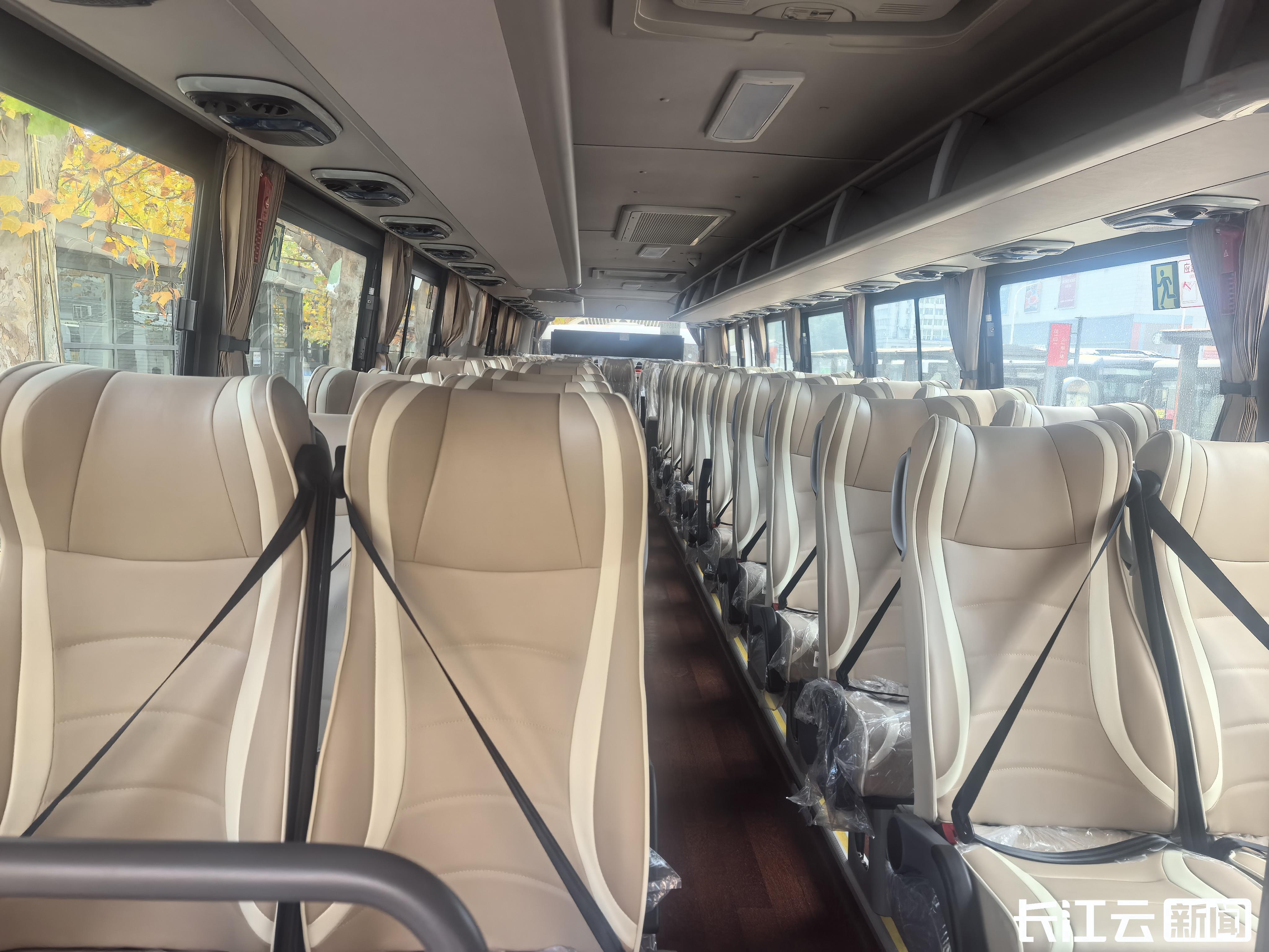 此次开通的定制公交共投入4台新配置的软座新能源车辆。车身长达12米,采用白蓝配色涂装,并印有醒目的“武汉公交”标识及“公交通勤 智慧畅行”字样,既与常规公交形成区分,也便于乘客识别。车内设有54个皮质座椅,每个座位均配备安全带,兼顾安全与舒适。新能源车辆运行平稳安静,还有效缓解了务工人员旅途劳顿。