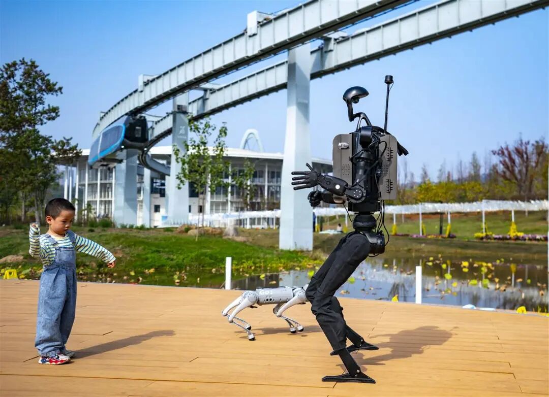 在光谷装上“智慧大脑”的人形机器人,乘空轨,看AI展,与小朋友在生态大走廊斗舞。(魏铼|摄)