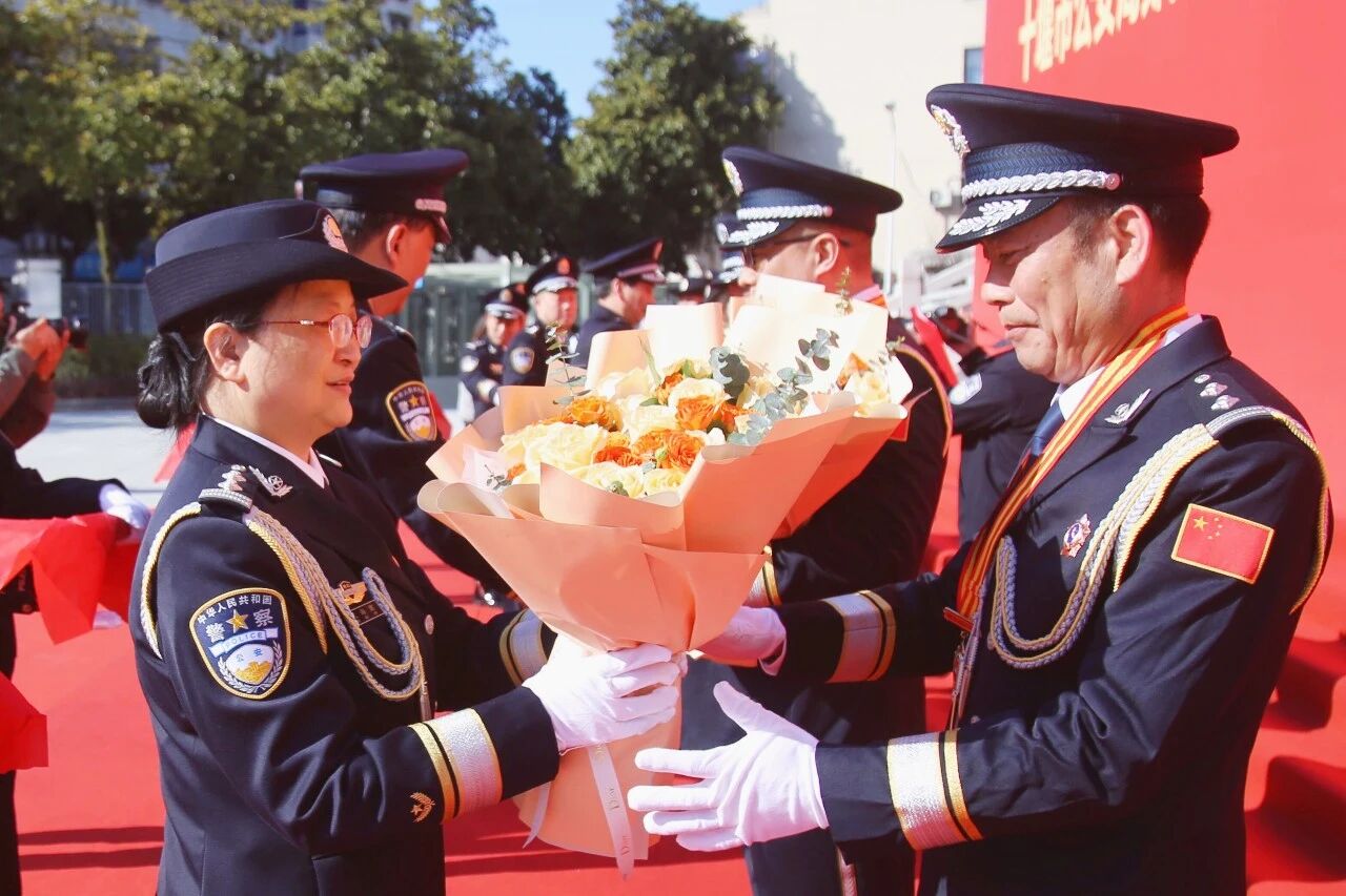 上午11时,仪式正式开始。100余名民警身着警礼服,警容严整、精神抖擞。伴随着激昂雄壮的《人民警察警歌》旋律,鲜艳的警旗冉冉升起,全体民警肃立行注目礼,目光紧随警旗,心中激荡着忠诚与担当的豪情。