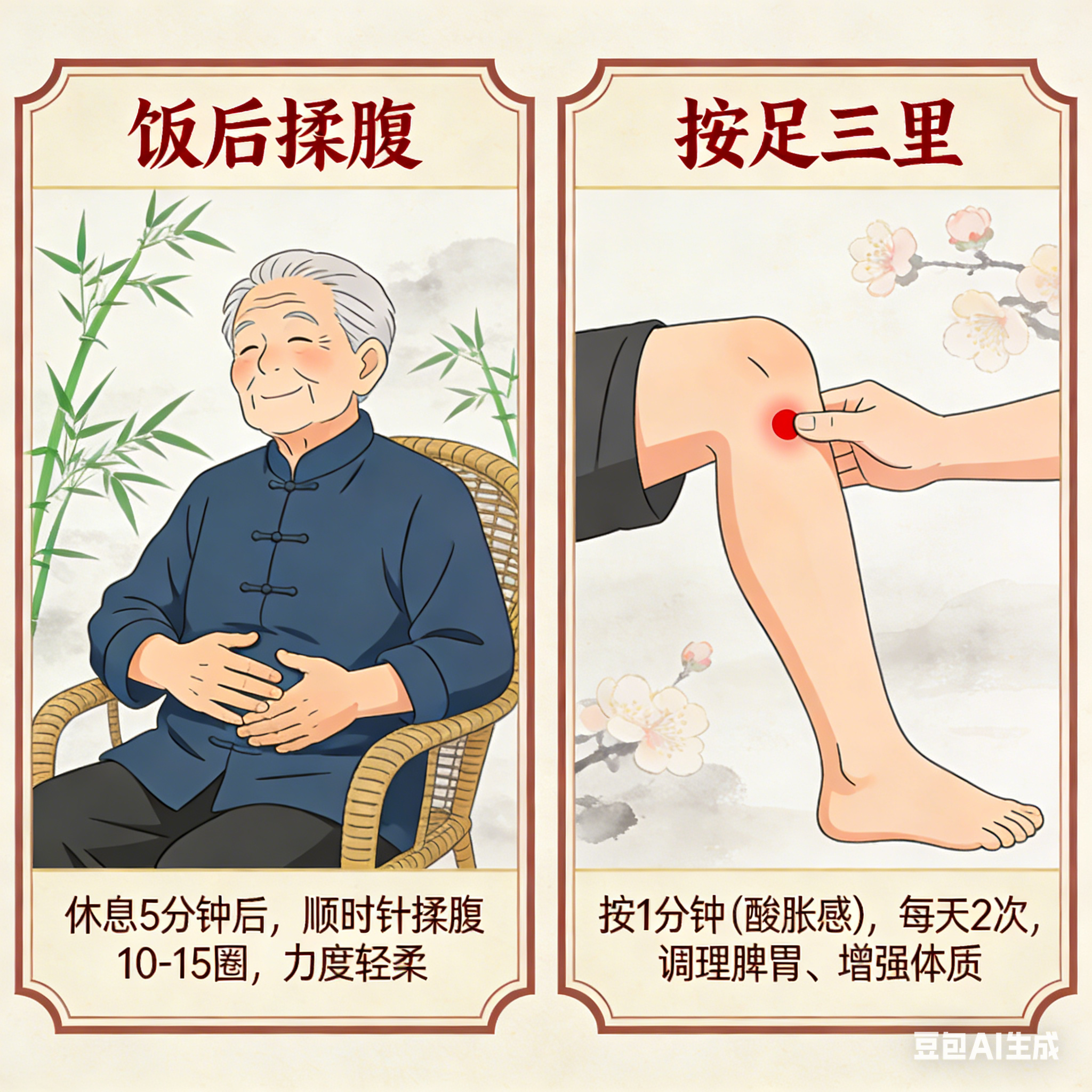 老人饭后别马上坐下或躺下,容易积食胀气。可以坐着休息5分钟后,用手掌顺时针轻轻揉腹部,每次10-15圈,力度要轻柔。中医讲,顺时针揉腹能促进脾胃运化,帮助气血循环;西医看来,揉腹能直接刺激胃肠蠕动,加快食物消化,缓解腹胀。