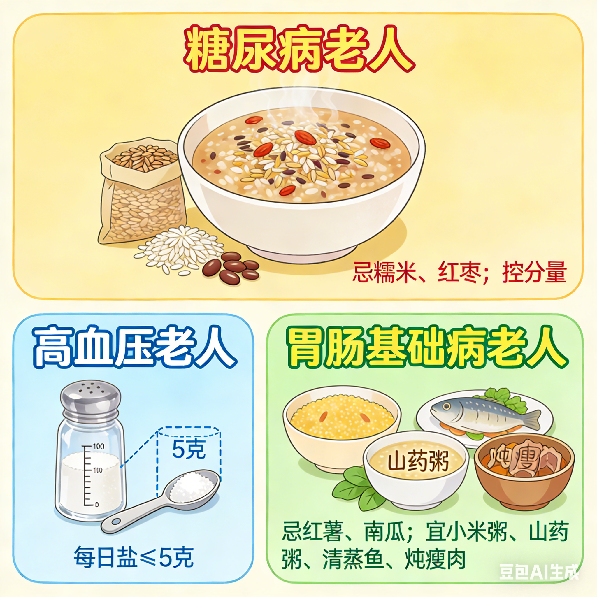 胃肠基础病(如胃炎、胃溃疡、肠炎)老人,避免吃红薯、南瓜等易产气或甜腻食物,可替换为小米粥、山药粥,肉类优先选清蒸鱼、炖瘦肉,减少胃肠刺激。