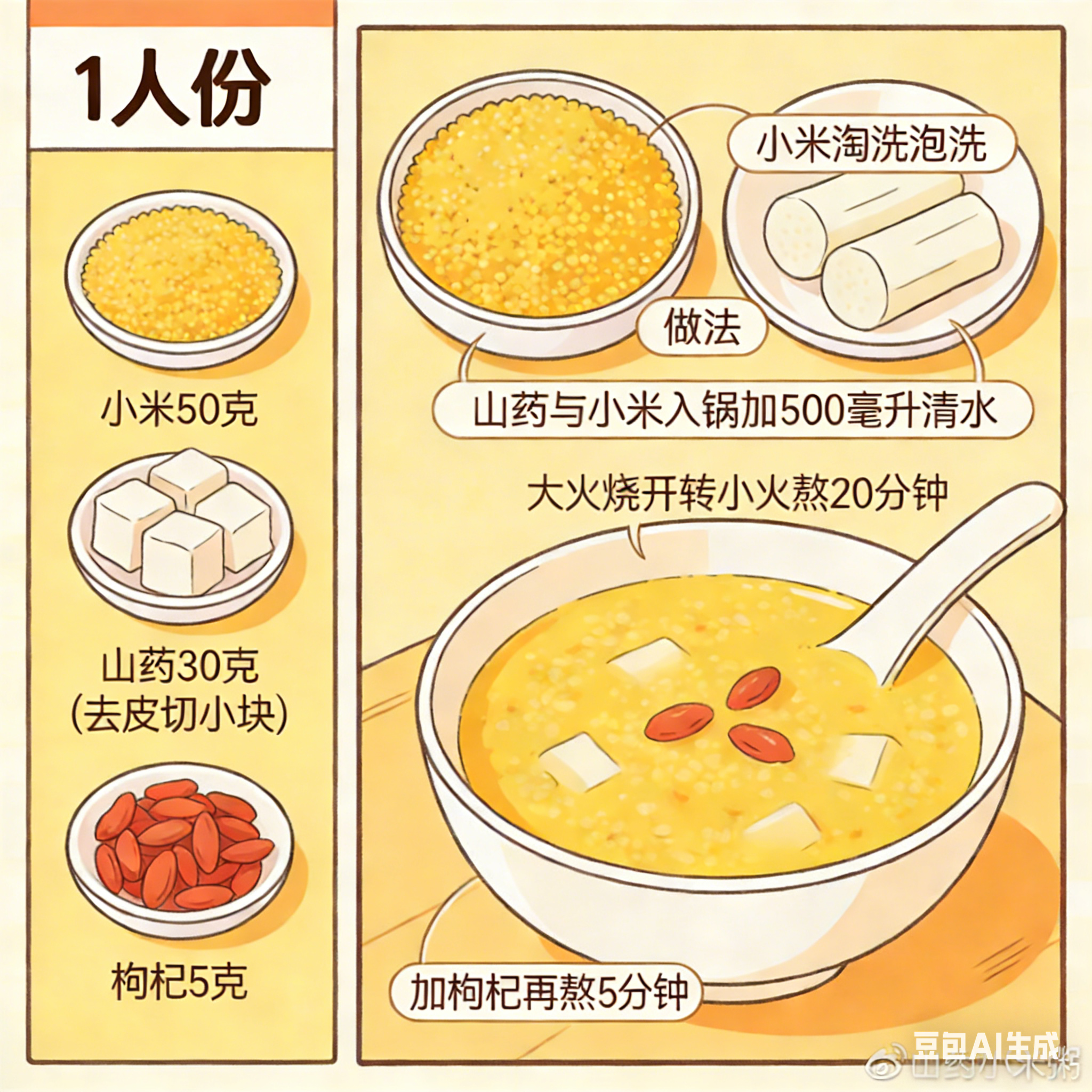 山药小米粥:食材(1人份):小米50克、山药30克(去皮切小块)、枸杞5克。