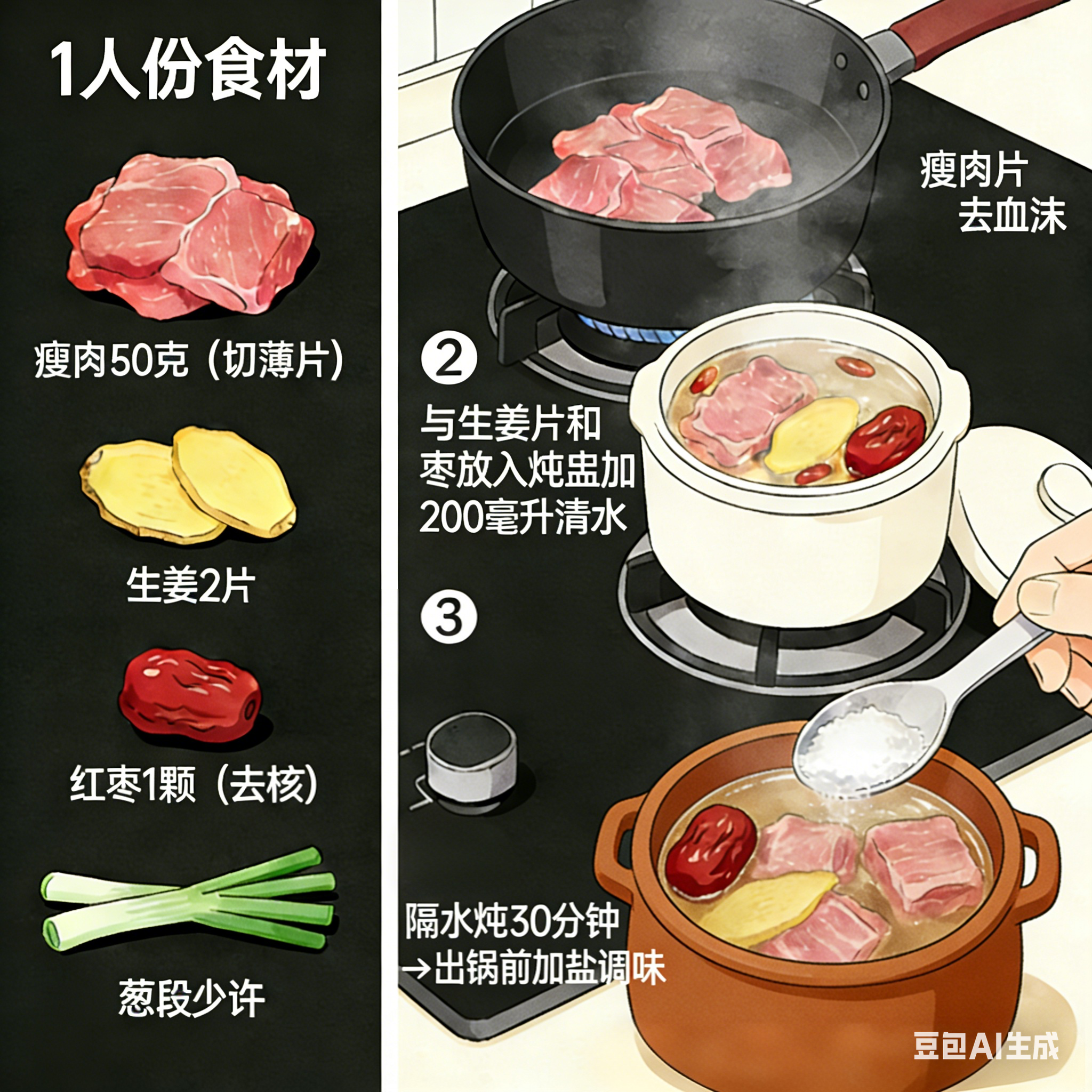 生姜红枣炖瘦肉:食材(1人份):瘦肉50克(切薄片)、生姜2片、红枣1颗(去核)、葱段少许。