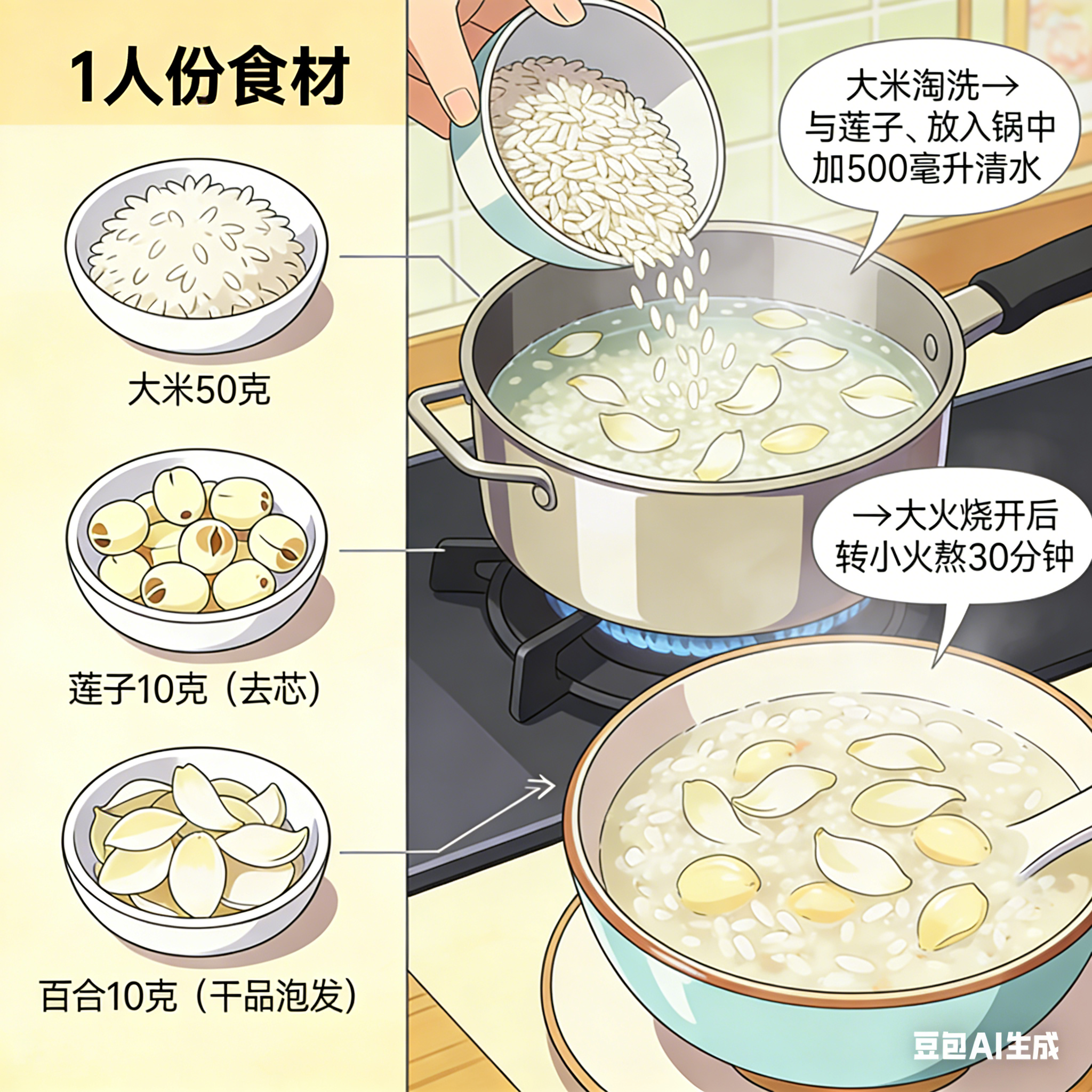 莲子百合粥:食材(1人份):大米50克、莲子10克(去芯)、百合10克(干品泡发)。