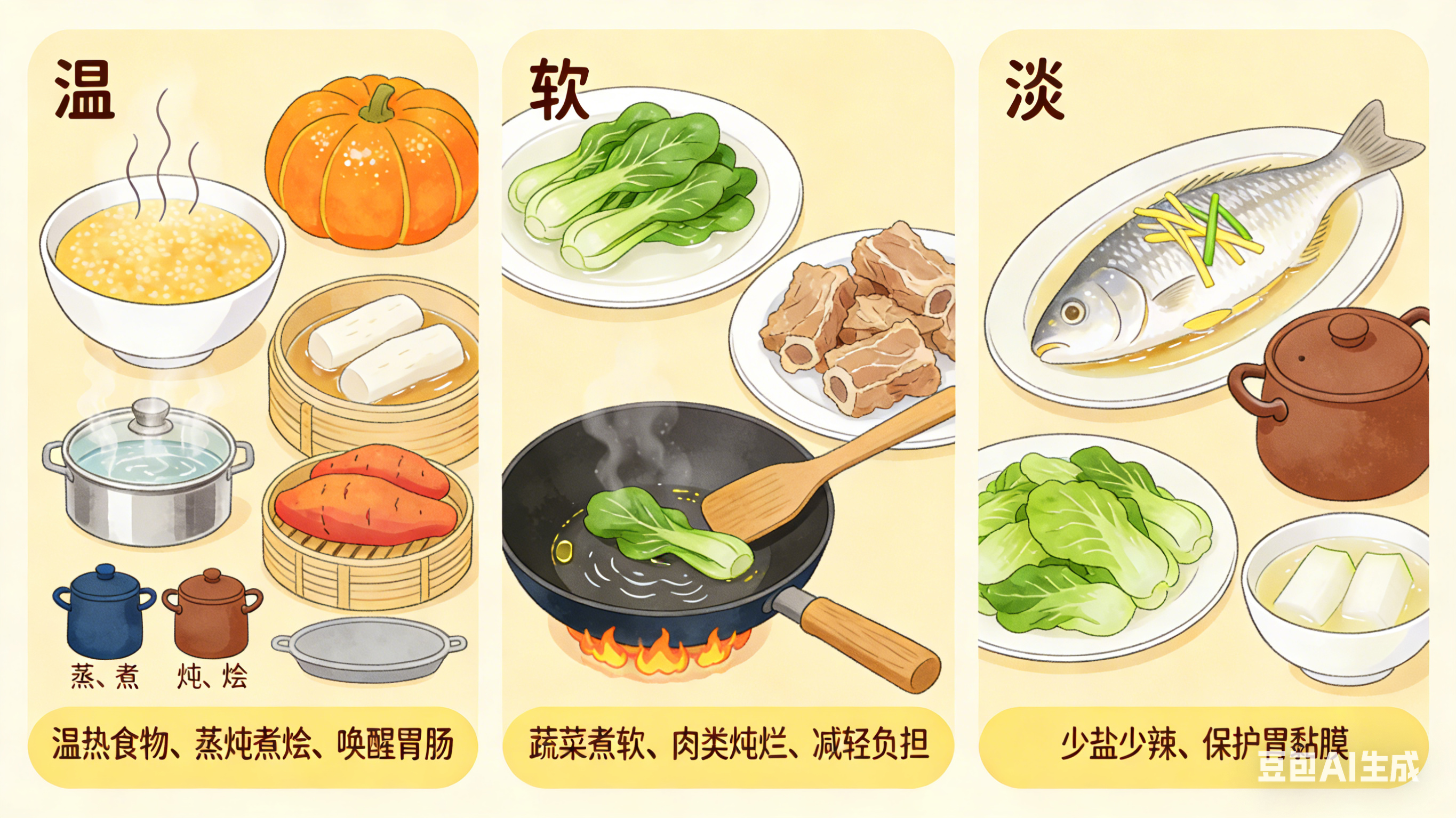 淡:少盐、少放辛辣调料,避免刺激胃黏膜。