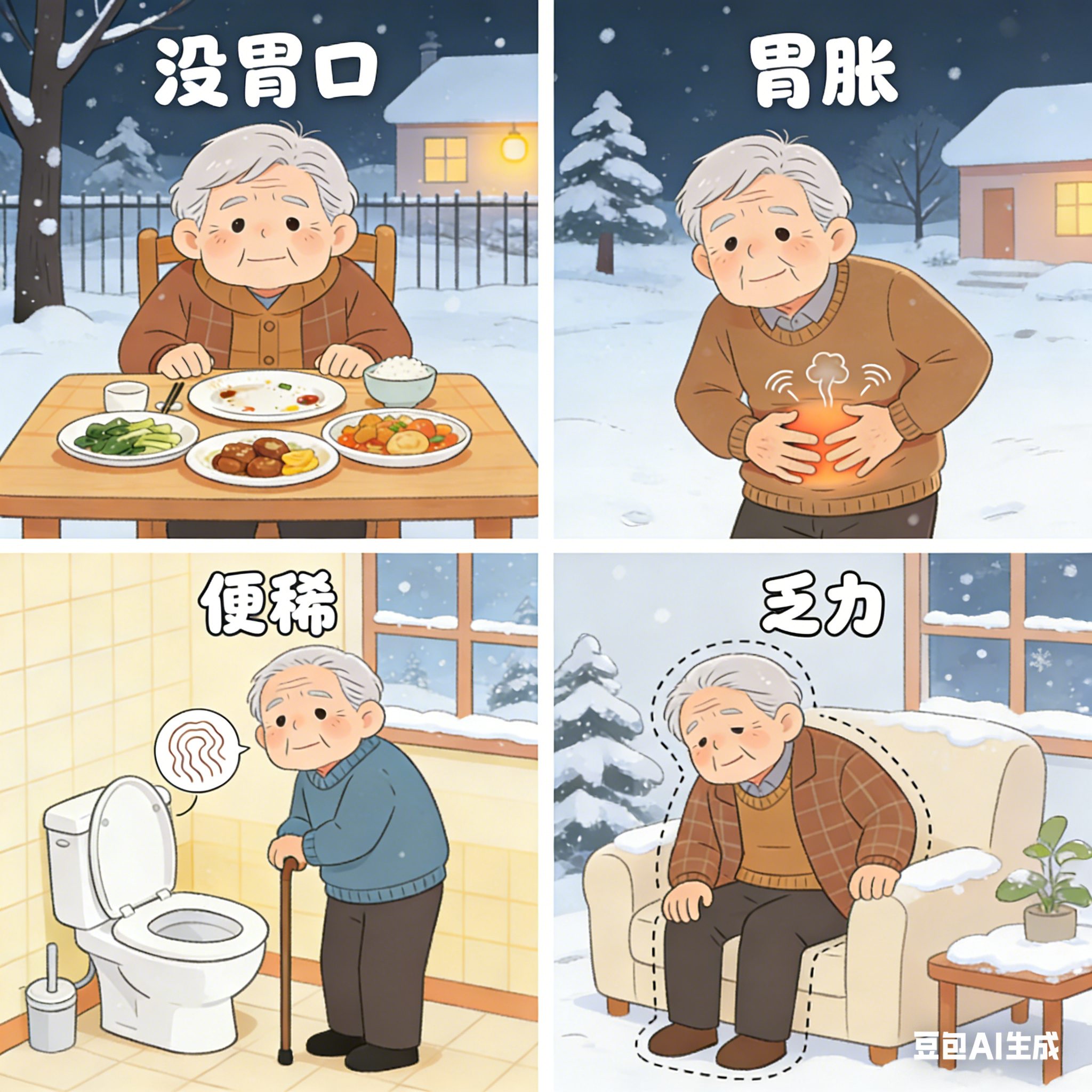 中西医都这么说中医认为,“脾主运化”“胃主受纳”,就像身体的“营养加工厂”。人老后脾胃功能本就减弱,冬季寒邪会直接侵袭脾胃,导致“脾胃阳气不足”——就像加工厂动力不足,吃进去的食物没法好好消化吸收,自然没胃口、没力气,还会让身体正气亏虚,难以抵御外邪。