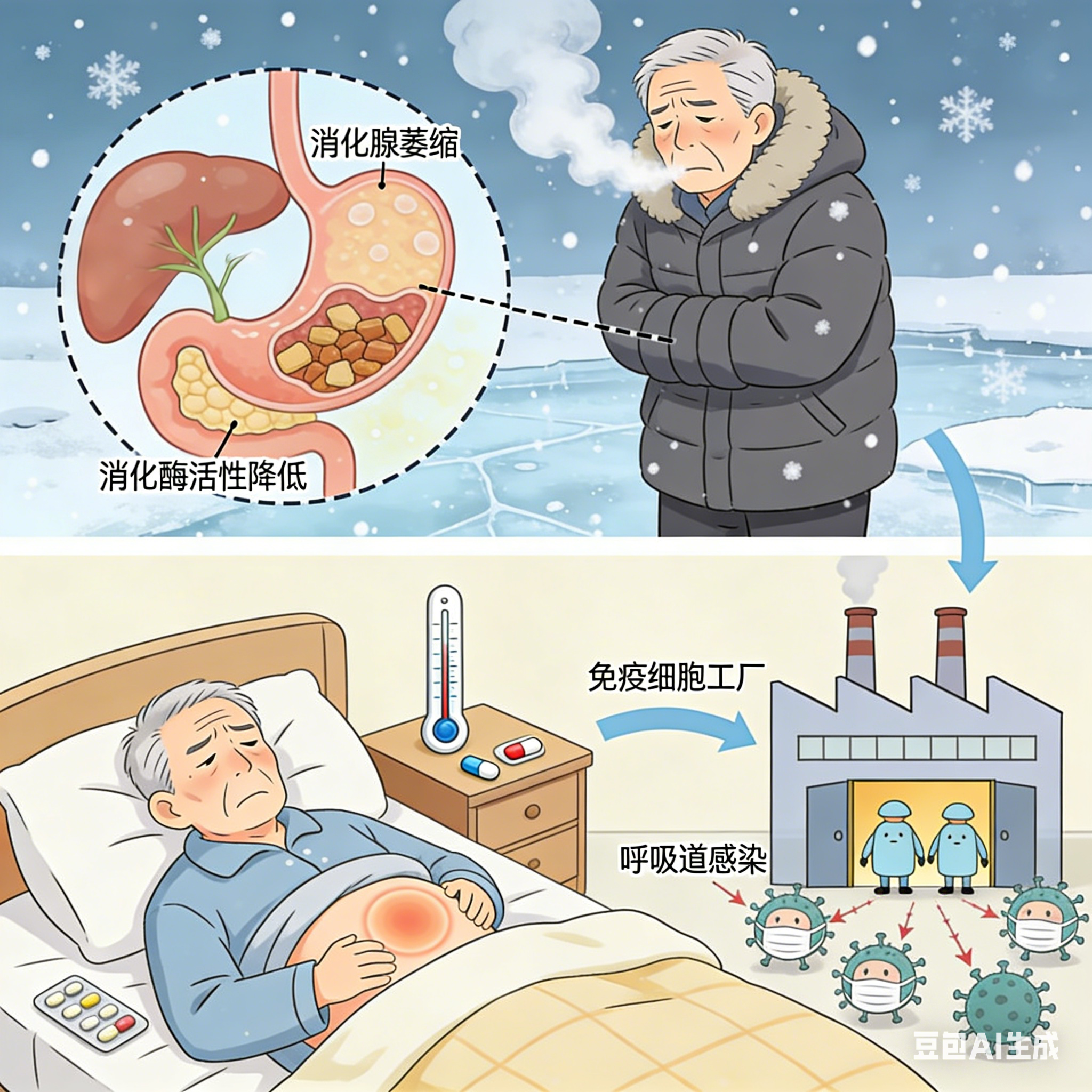 从西医角度看,老年人消化腺萎缩、消化酶活性降低,胃肠蠕动速度只有年轻人的一半。低温会进一步抑制消化酶分泌,让胃肠蠕动更慢,进而引发消化不良、腹胀、便秘或腹泻;同时,营养吸收不好会导致免疫力下降,增加呼吸道感染、代谢紊乱的风险,对有糖尿病、高血压的老人来说,还可能加重身体负担。