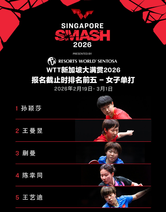 WTT新加坡大满贯2026由新加坡圣淘沙名胜世界呈献,将于2026年2月19日至3月1日在新加坡体育中心举行。届时世界顶尖运动员将齐聚狮城,共同争夺2000点世界排名积分。报名截止时排名前五名单如下: