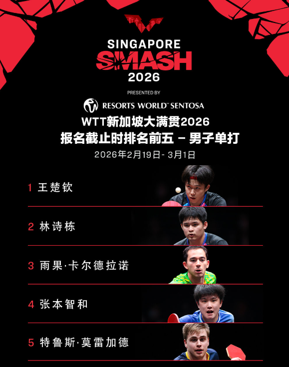 TT新加坡大满贯2026由新加坡圣淘沙名胜世界呈献,将于2026年2月19日至3月1日在新加坡体育中心举行。届时世界顶尖运动员将齐聚狮城,共同争夺2000点世界排名积分。报名截止时排名前五名单如下: