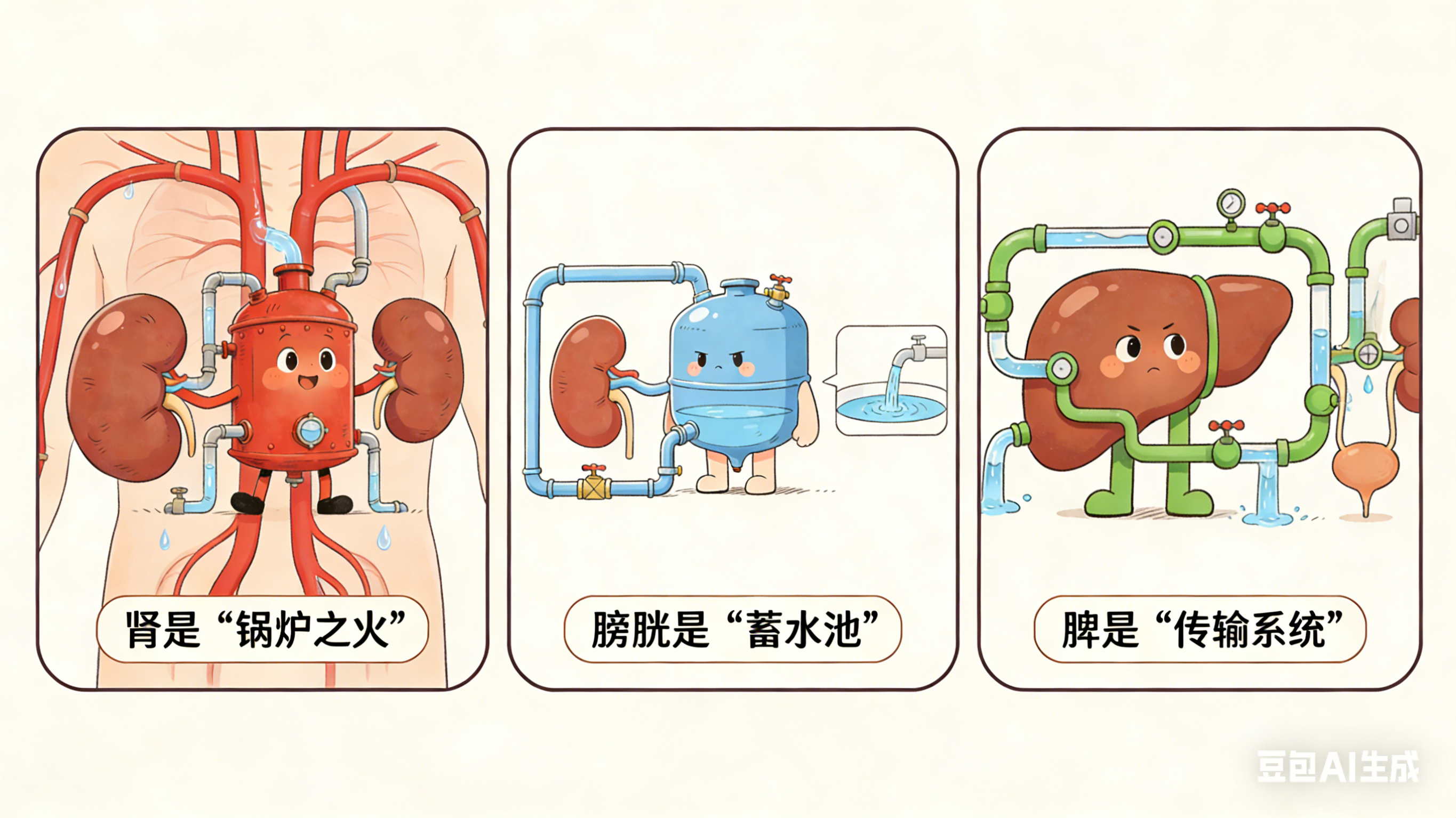 · 肾是“锅炉之火”——负责蒸腾气化,将有用的水分重新输布全身,无用的则下输膀胱。